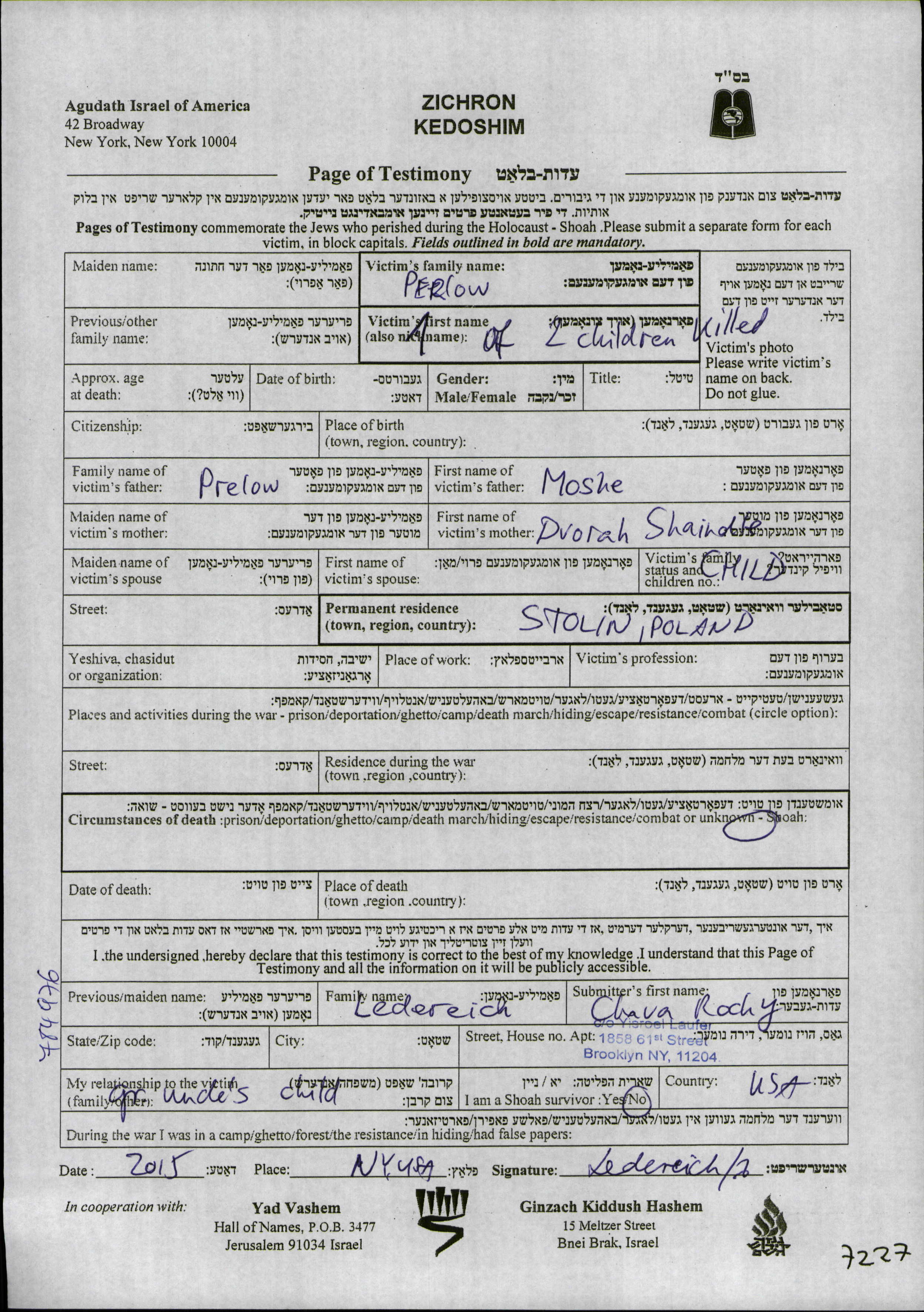 Perlow prénom inconnu Stolin, Pologne Feuille de témoignage
