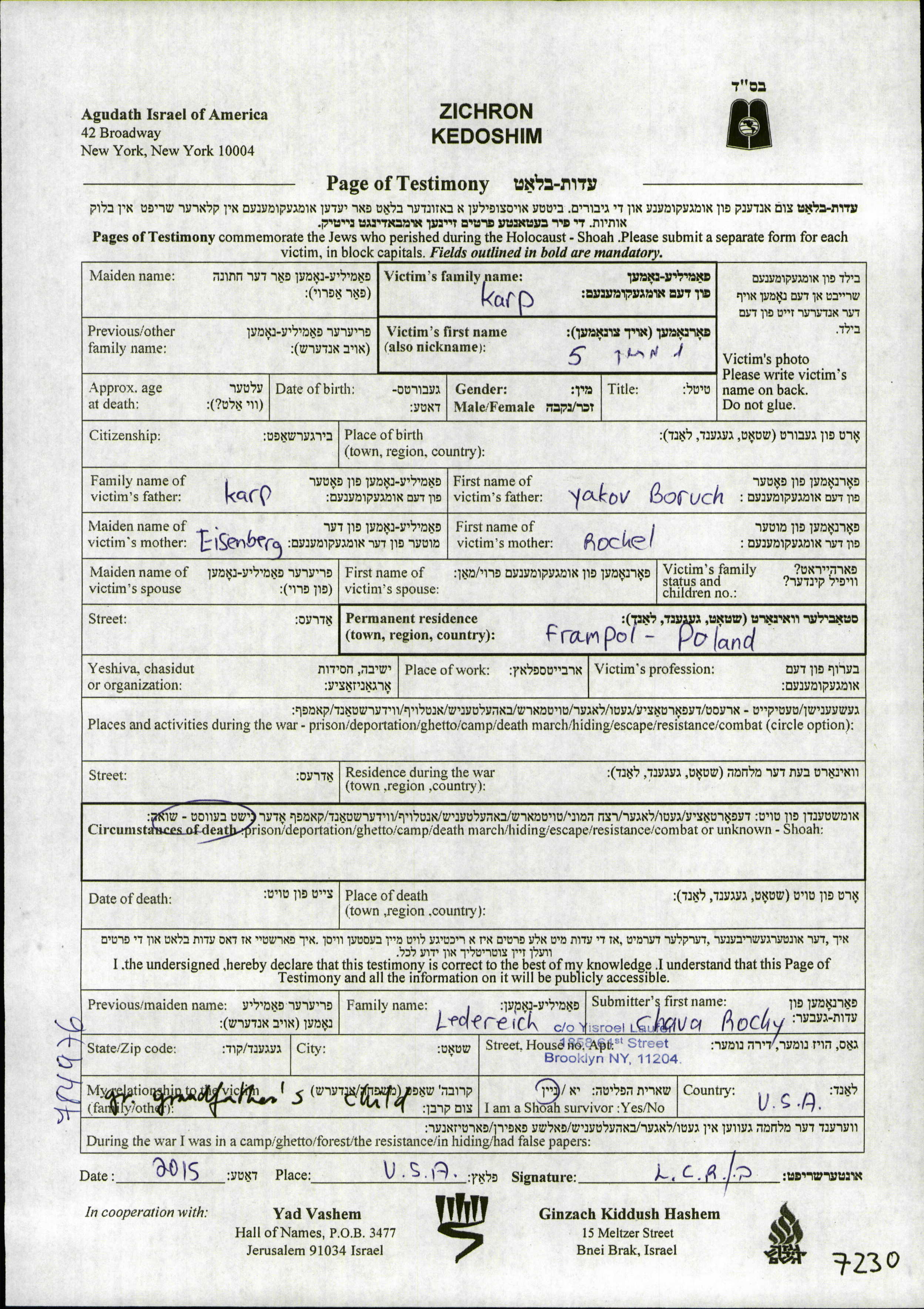 Karp prénom inconnu Frampol, Pologne Feuille de témoignage