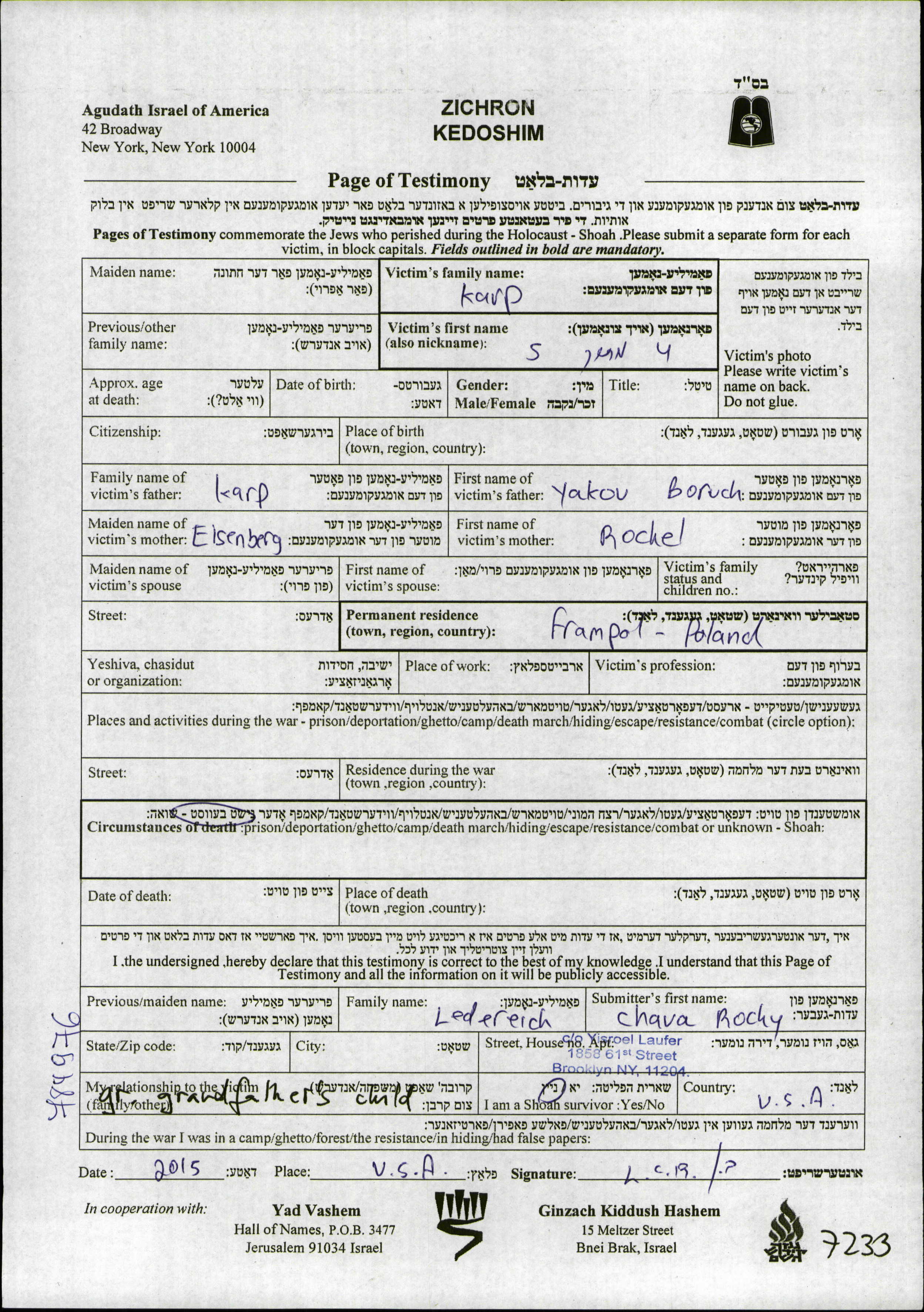 Karp prénom inconnu Frampol, Pologne Feuille de témoignage