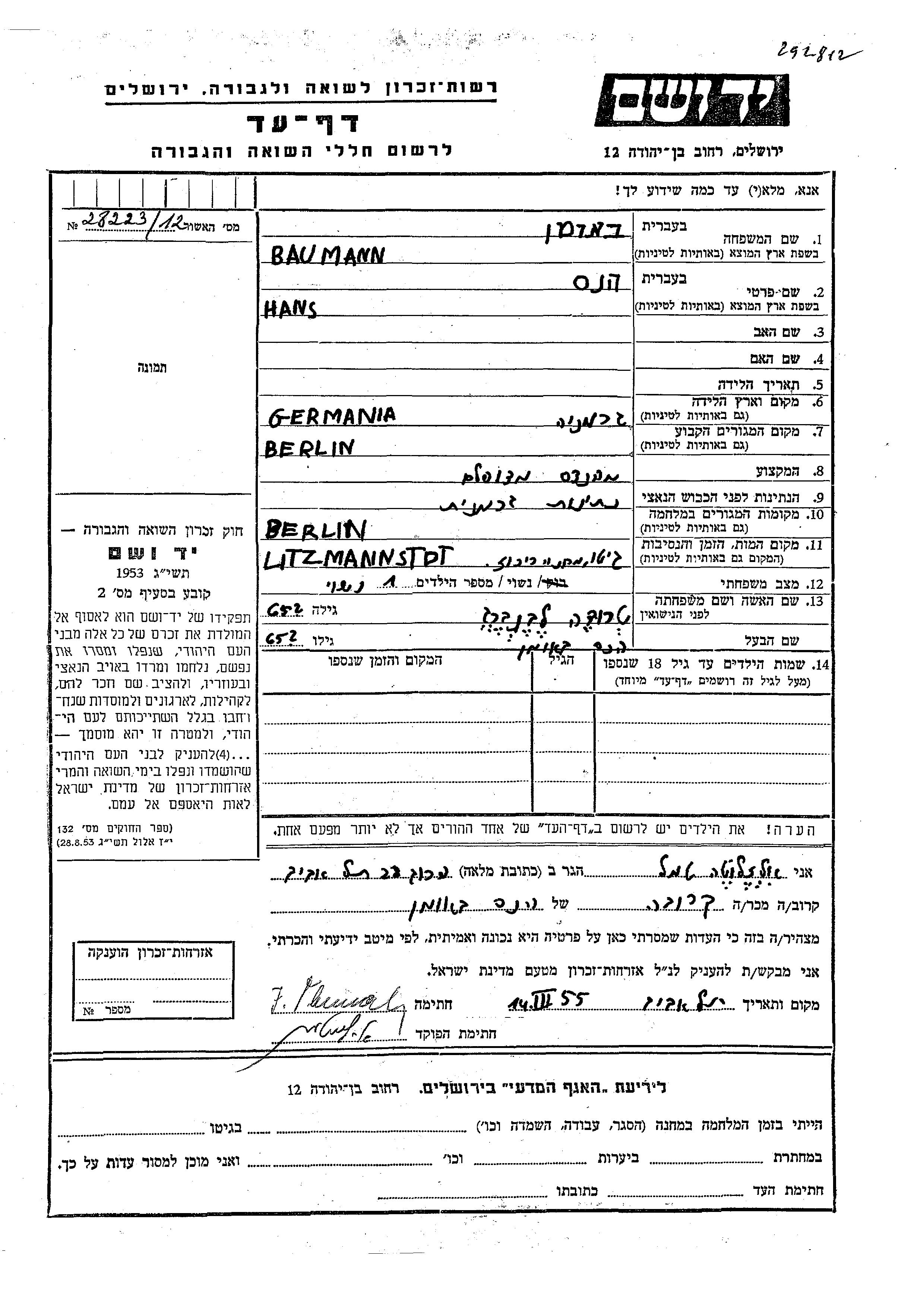 Hans Baumann est né à Allemagne. Il était Ingénieur et Mariée à Trude née Lebenberg. Avant la seconde guerre mondiale il vivait à Berlin, Allemagne. Au cours de la guerre, il était à Berlin, Allemagne.