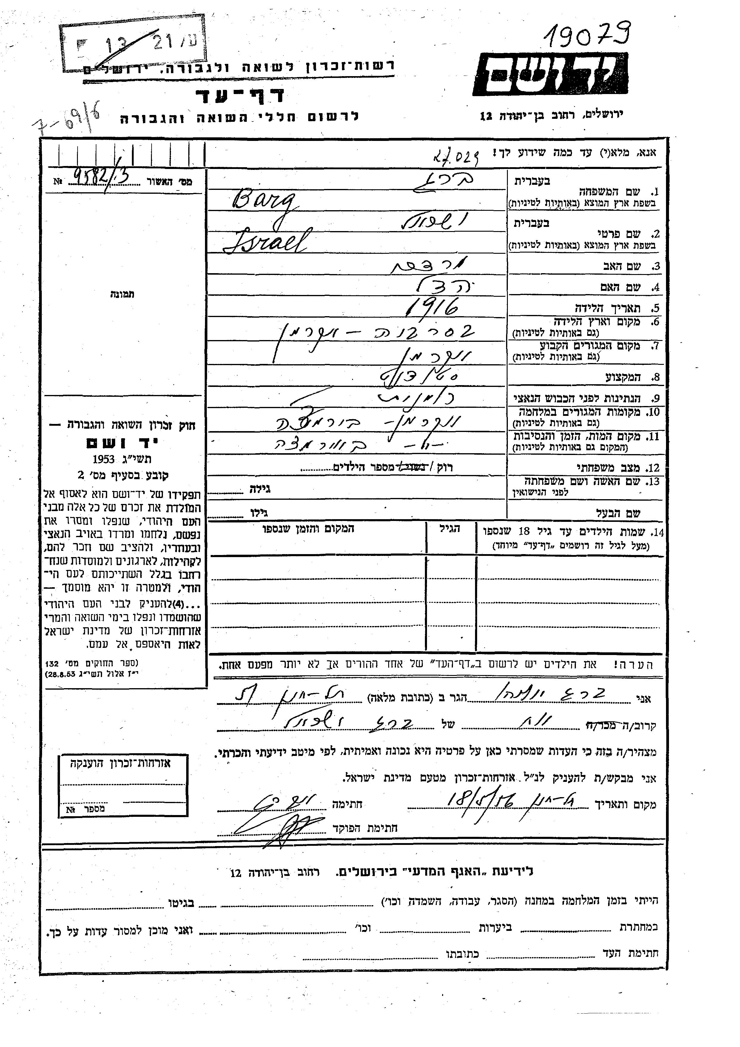 Berg Izrael 1916 endroit inconnu, Feuille de témoignage
