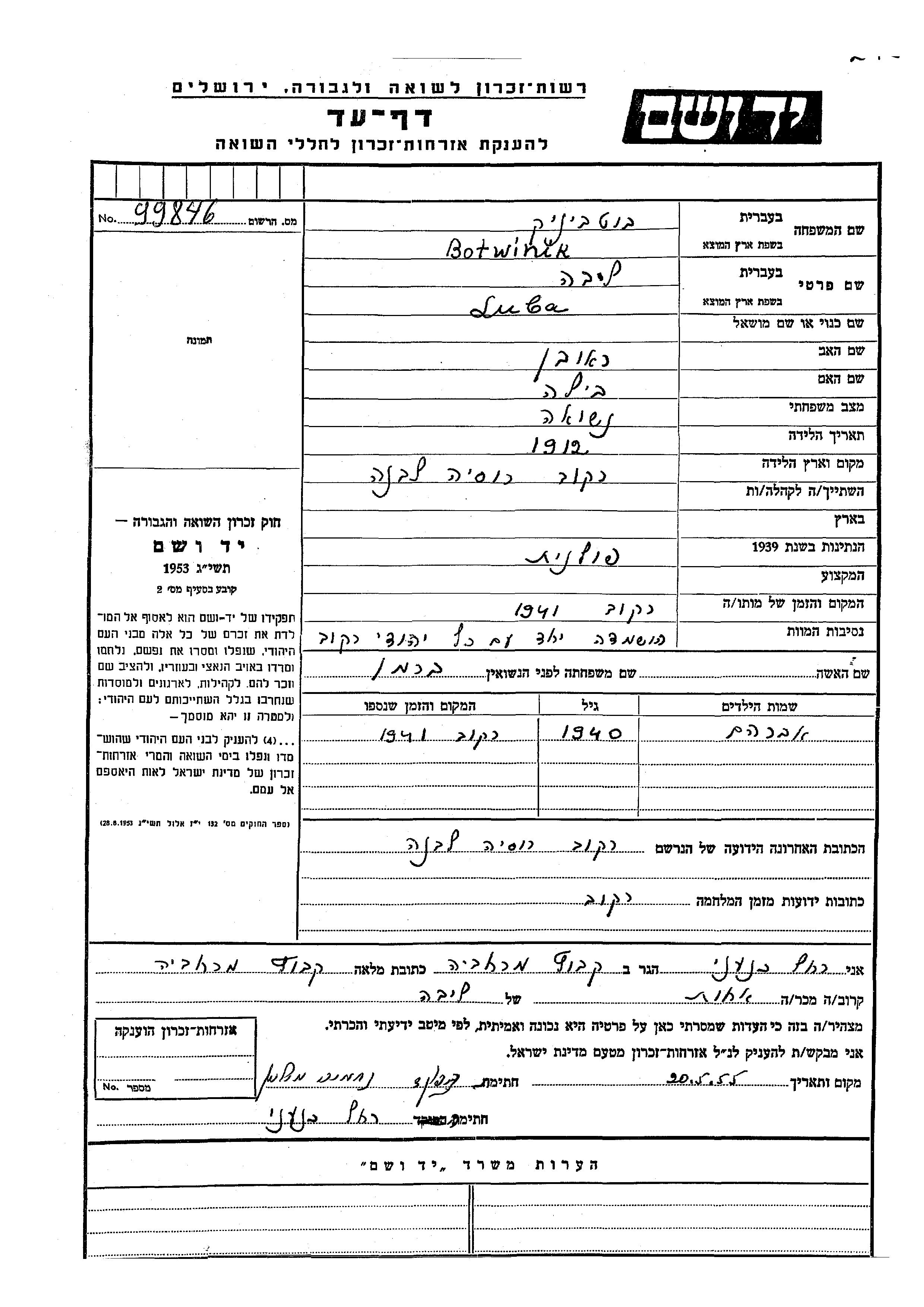 Botwinik Luba 1912 endroit inconnu, Feuille de témoignage