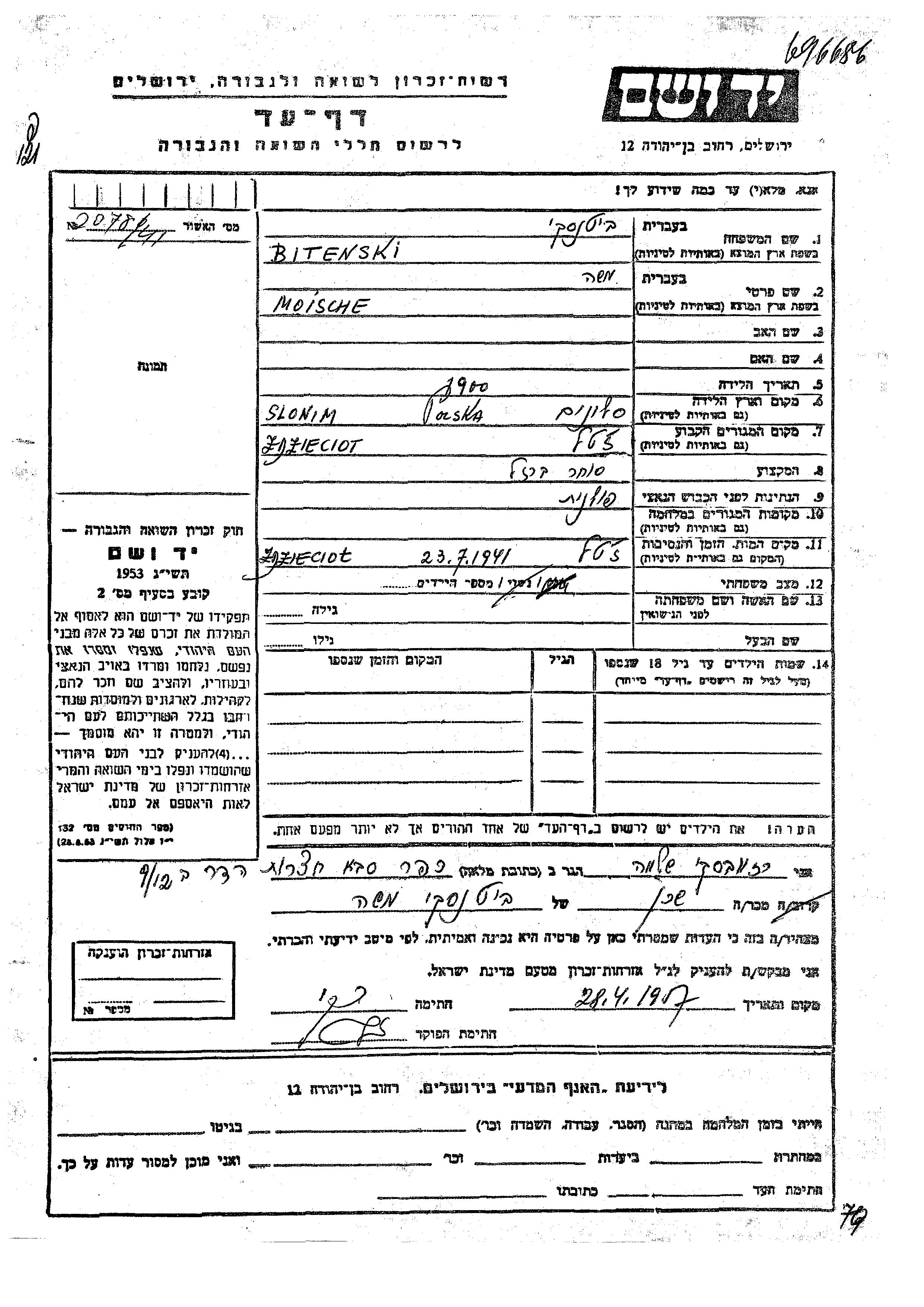 Moische Bitenski est né à Slonim, Pologne en 1900. Il était Négociant en fer et Célibataire. Avant la seconde guerre mondiale il vivait à Zdzieciol, Pologne. Au cours de la guerre, il était à Zdzieciol, Pologne.