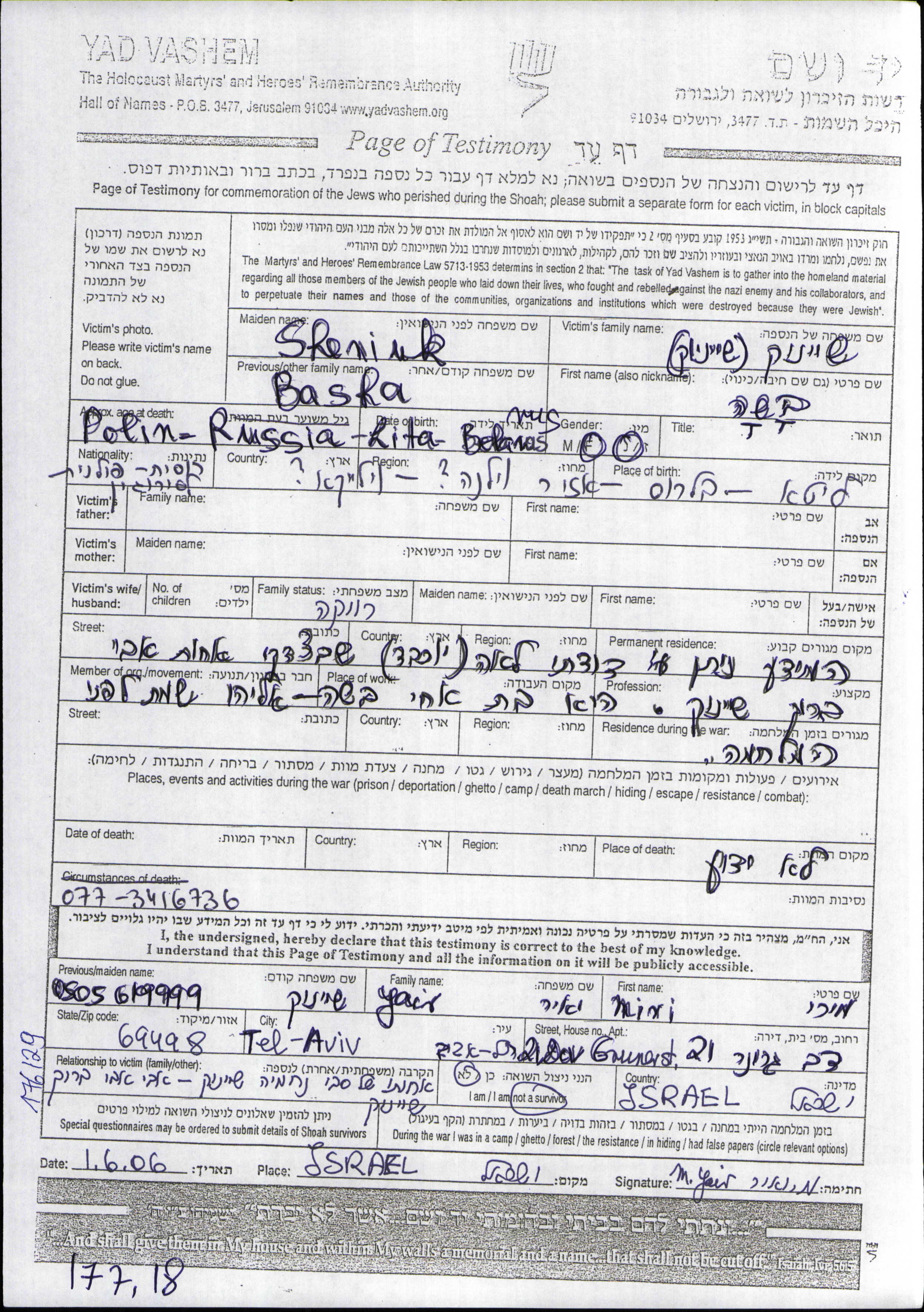 Sheniuk Basha endroit inconnu, Feuille de témoignage