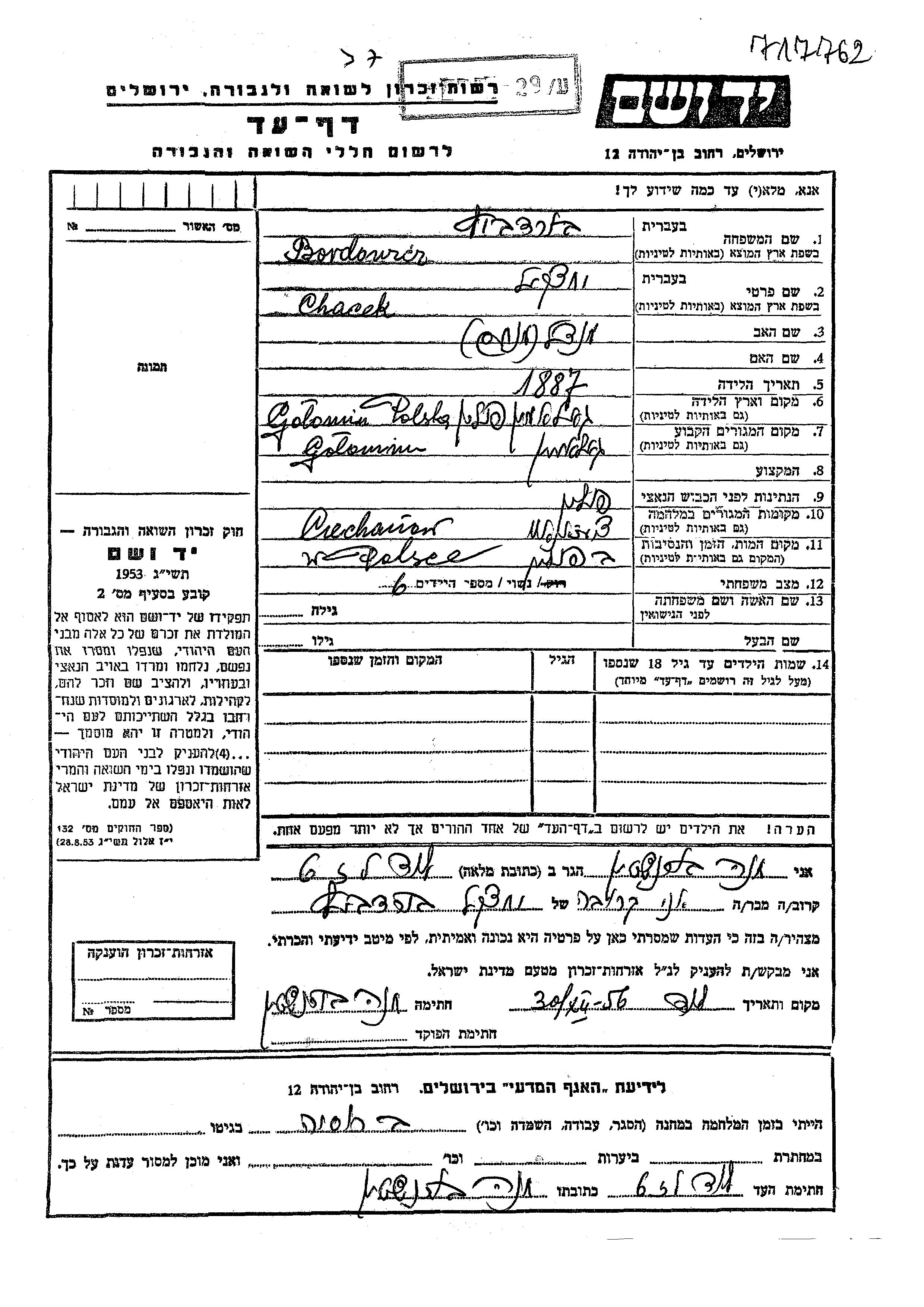 Chacek Bordowicz est né à Golomin, Pologne en 1887, fils de Mendel Menakhem. Il était Marié. Avant la seconde guerre mondiale il vivait à Golomin, Pologne.