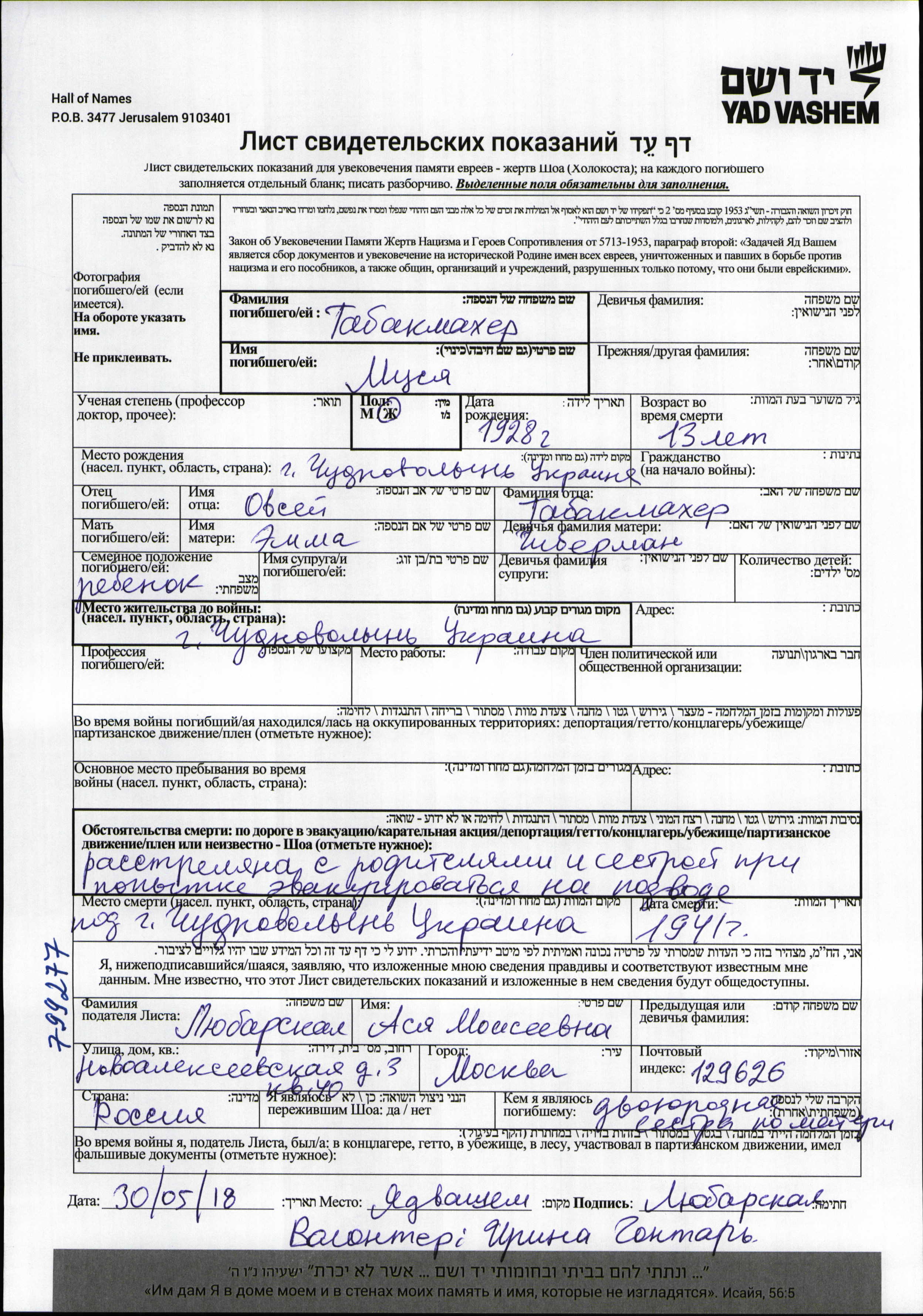 Tabakmakher Musya 1928 Chudnov Volynskiy, Ukraine (URSS) Feuille de témoignage