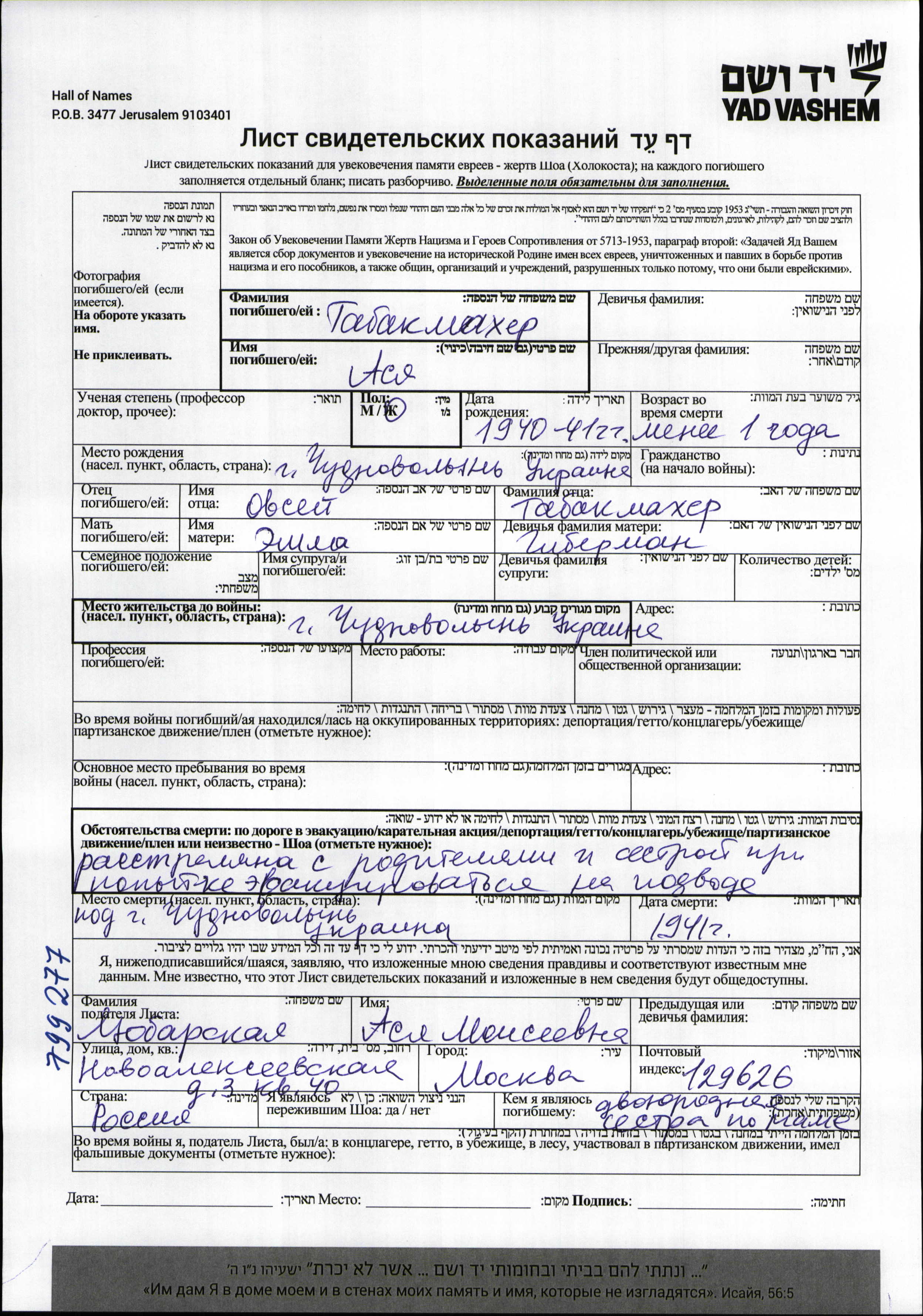 Tabakmakher Asya 1940 Chudnov Volynskiy, Ukraine (URSS) Feuille de témoignage