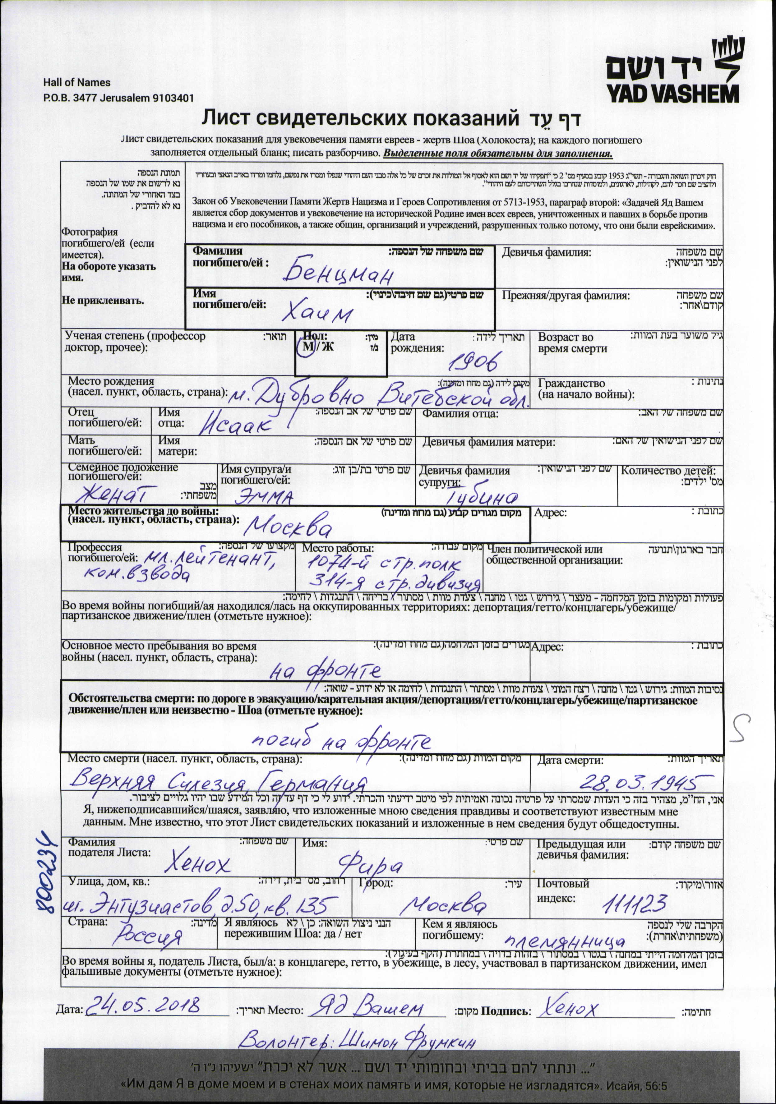 Sous-lieutenant Khaim Bentzman est né à Dubrovno, Bélorussie (URSS) en 1906, fils de Isaak. Il était Mariée à Emma née Tubina. Avant la seconde guerre mondiale il vivait à Moskva, Russie (URSS). Au cours de la guerre, il était à the Soviet armed forces. Sous-lieutenant Bentzman a été tué en tant que militaire pendant la Seconde Guerre mondiale. Lieu de la mort: <> (<>), Allemagne en 28/03/1945.