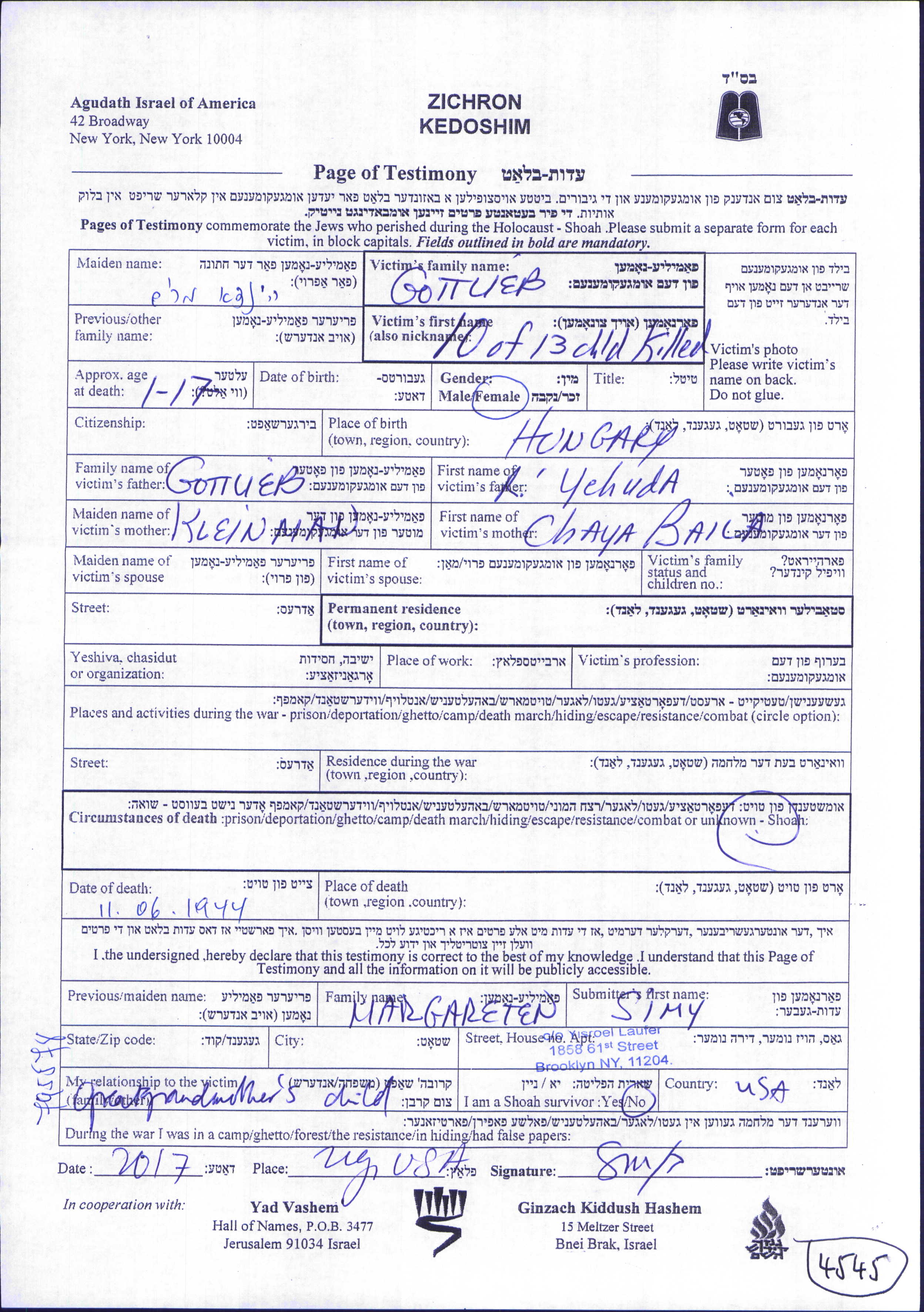 Gottlieb Hinda Miriam endroit inconnu, Feuille de témoignage