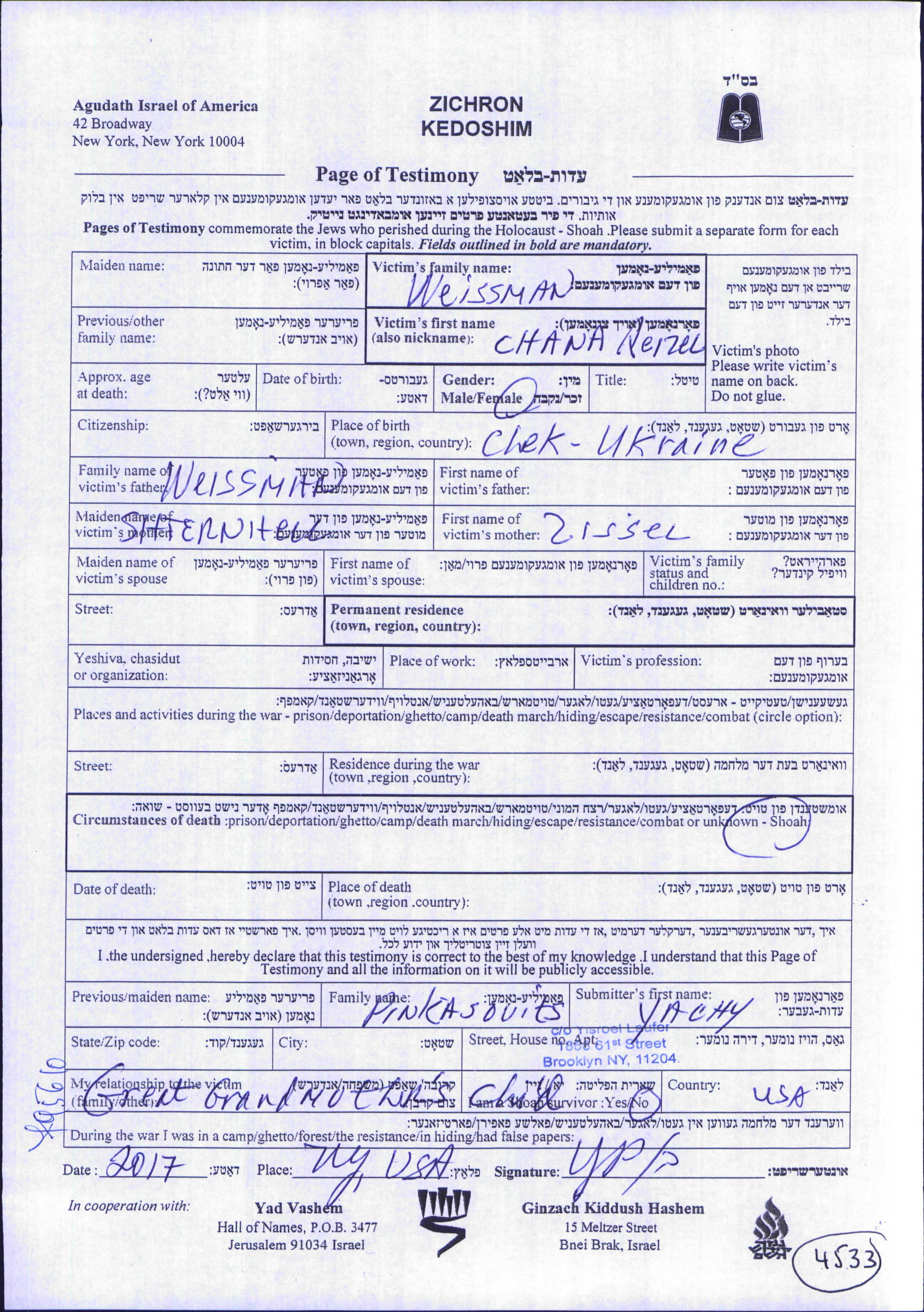 Weissman Chana Reizel endroit inconnu, Feuille de témoignage