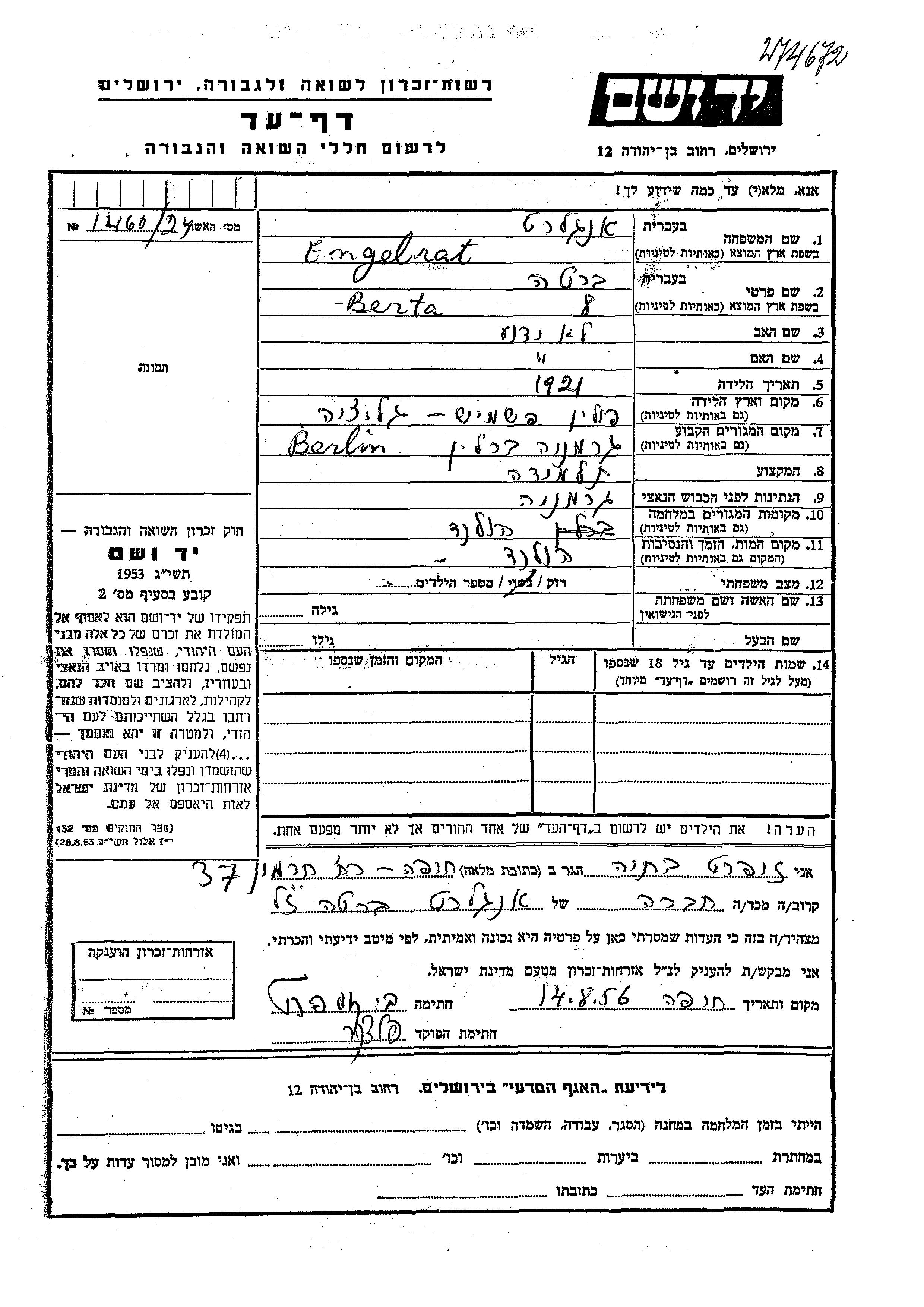 Berta Engelrat est née en 1921. Elle était Élève et Célibataire. Avant la seconde guerre mondiale elle vivait à Berlin, Allemagne. Pendant la guerre, elle était à Pays-Bas.