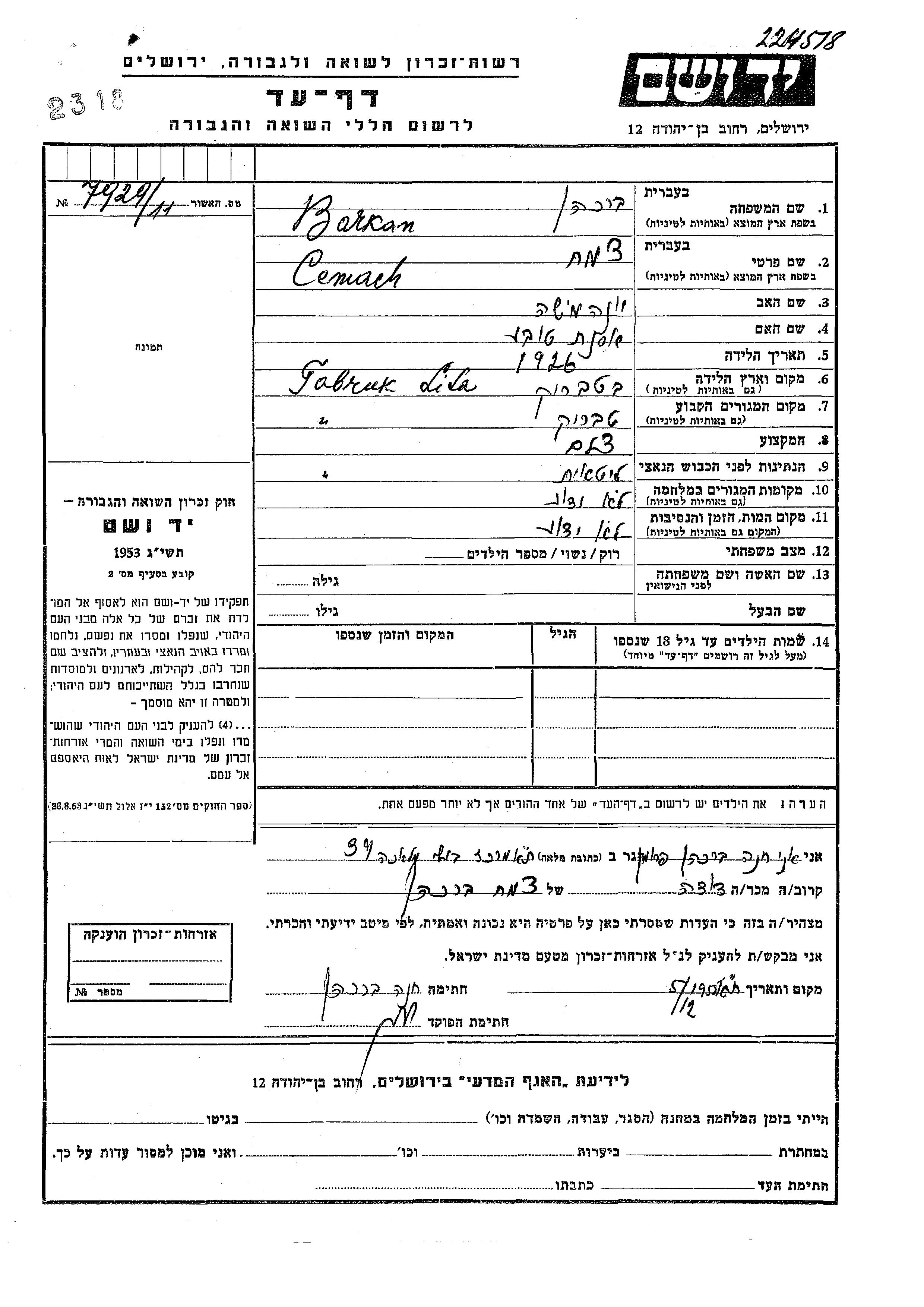Cemach Barkan est né à Tavrig, Lituanie en 1926, fils de Yona Moshe et de Asnat Tove. Il était Photographe. Avant la seconde guerre mondiale il vivait à Tavrig, Lituanie.