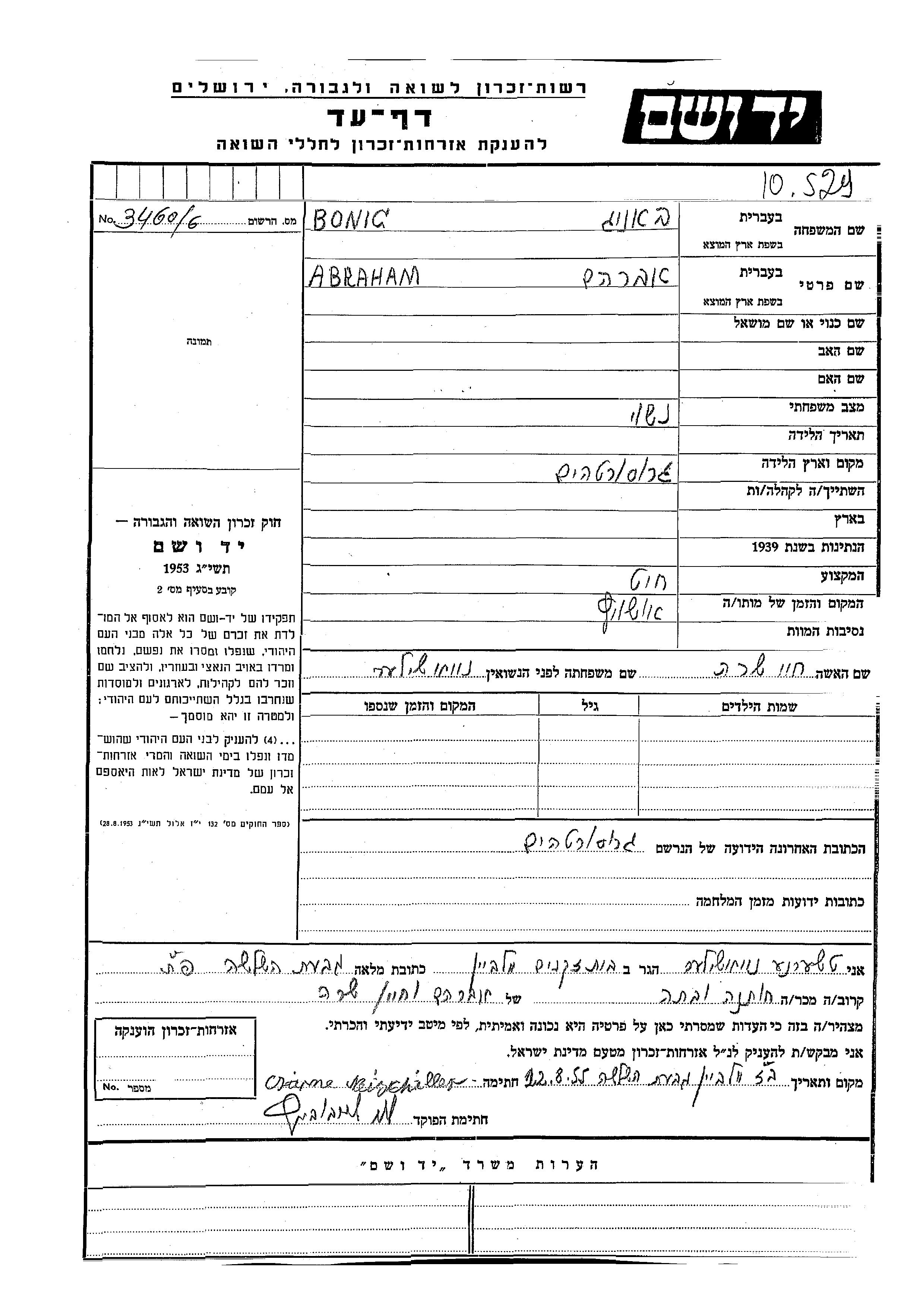 Bonig Abraham Grosswardein, Roumanie Feuille de témoignage