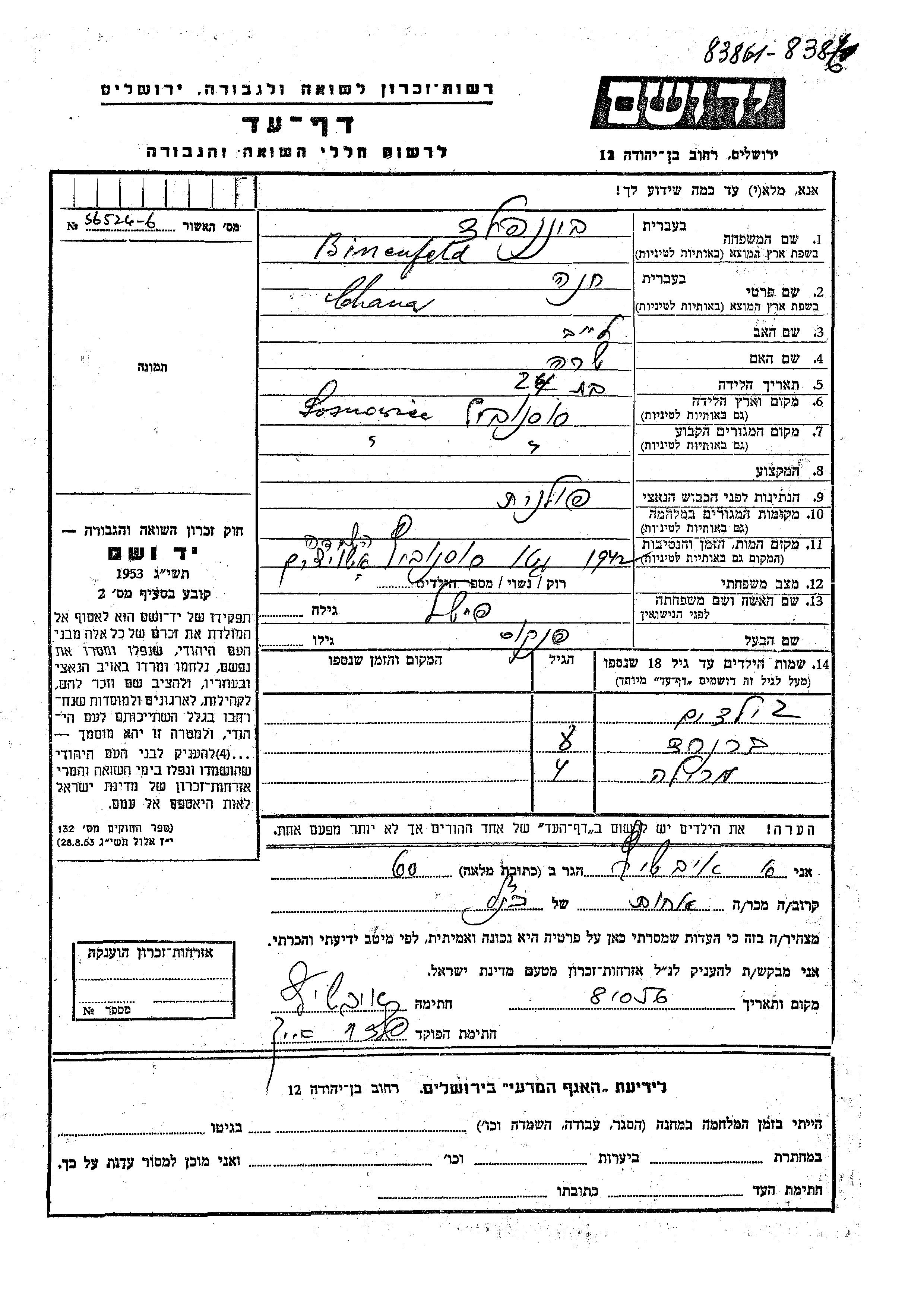 Chana Binenfeld née Fishel est née à Sosnowic, Pologne, fille de Leib et de Sara. Elle était Mariée à Pinkhas. Avant la seconde guerre mondiale elle vivait à Sosnowic, Pologne.