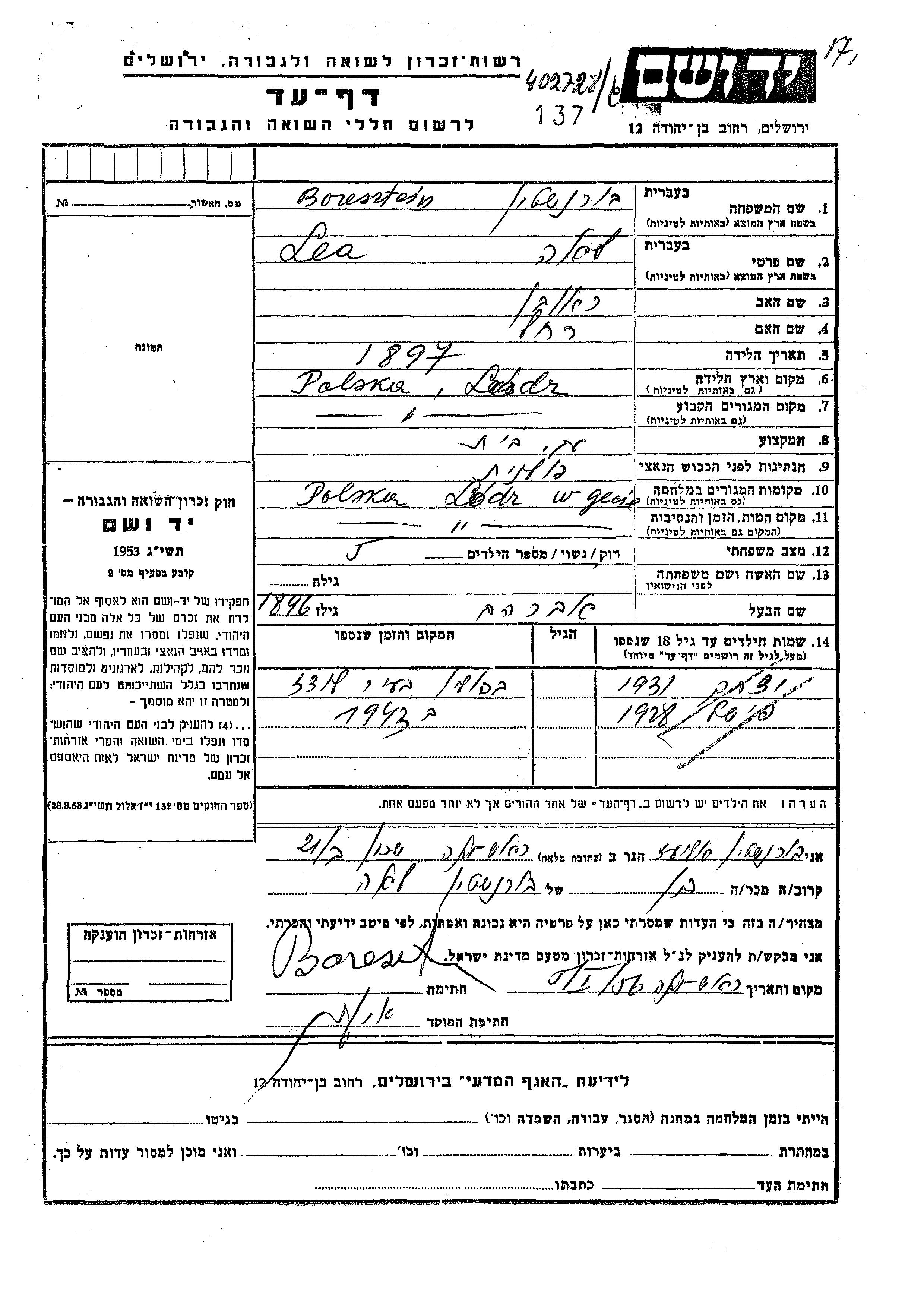 Lea Borestain est née en 1897, fille de Reuven et de Rakhel. Elle était Femme au foyer et Mariée à Avraham.