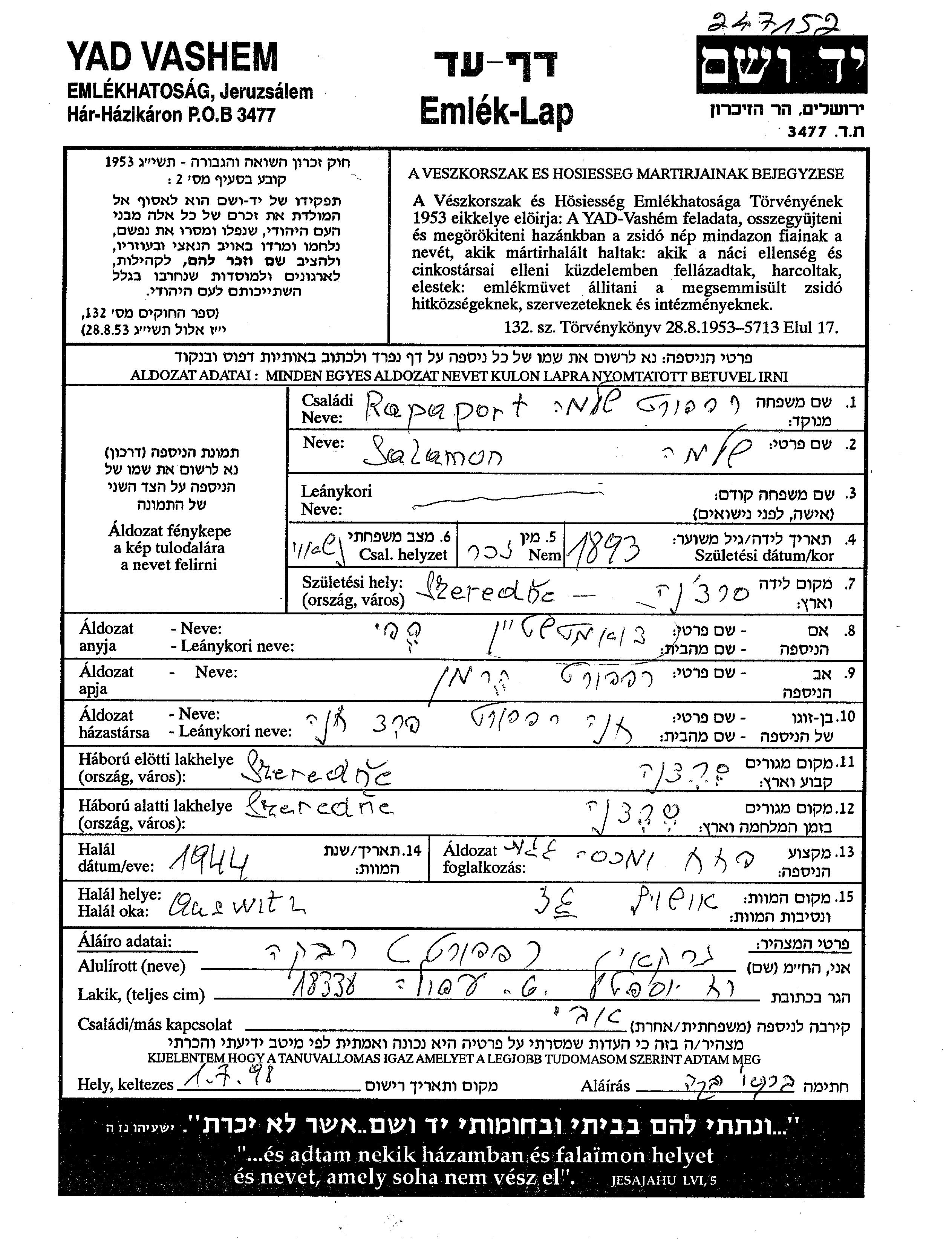 Rapaport | Salamon | 1893 | Seredne, Tchécoslovaquie | Feuille de témoignage |