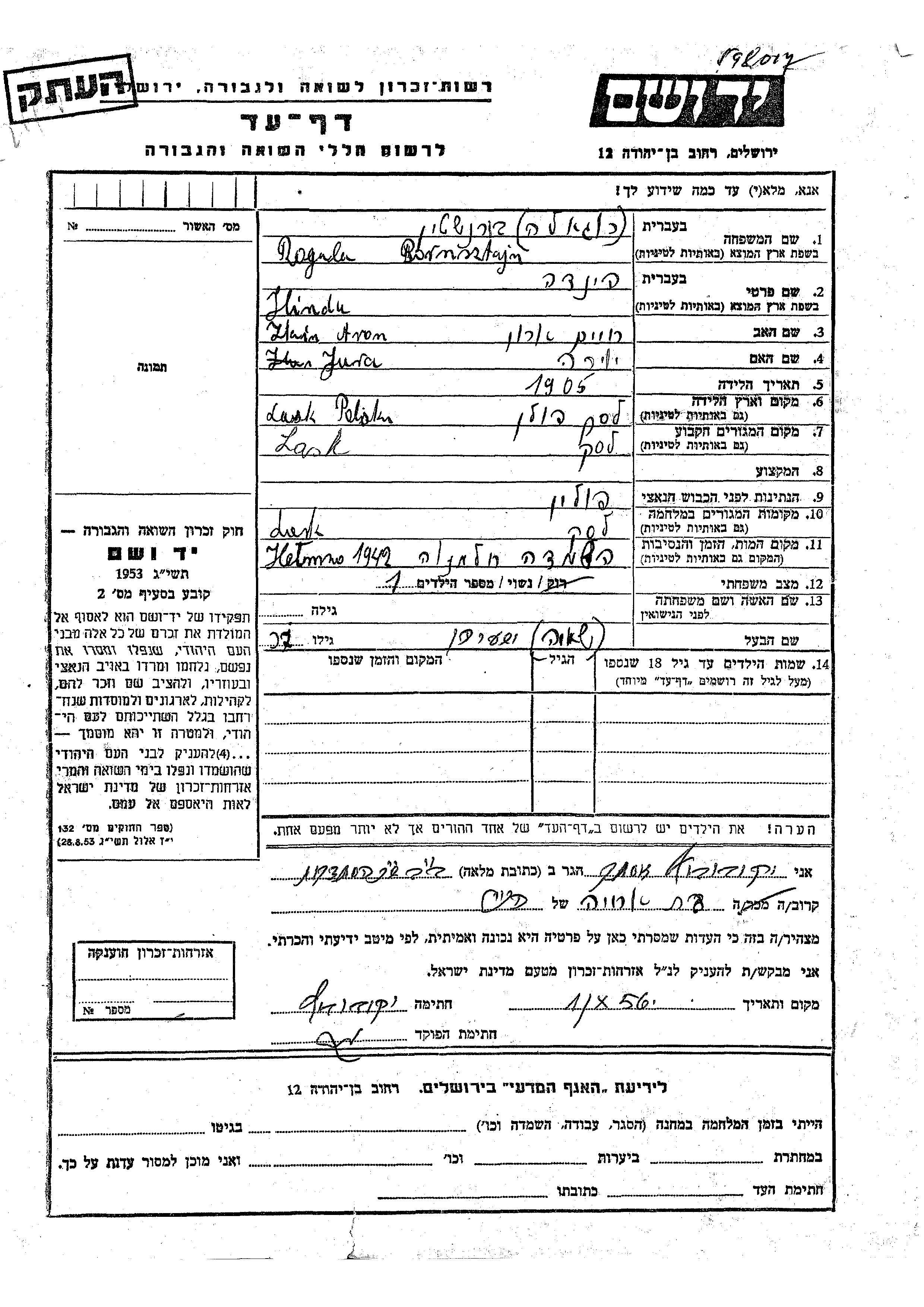 Bornsztajn Hinda 1905 Lask, Pologne Feuille de témoignage