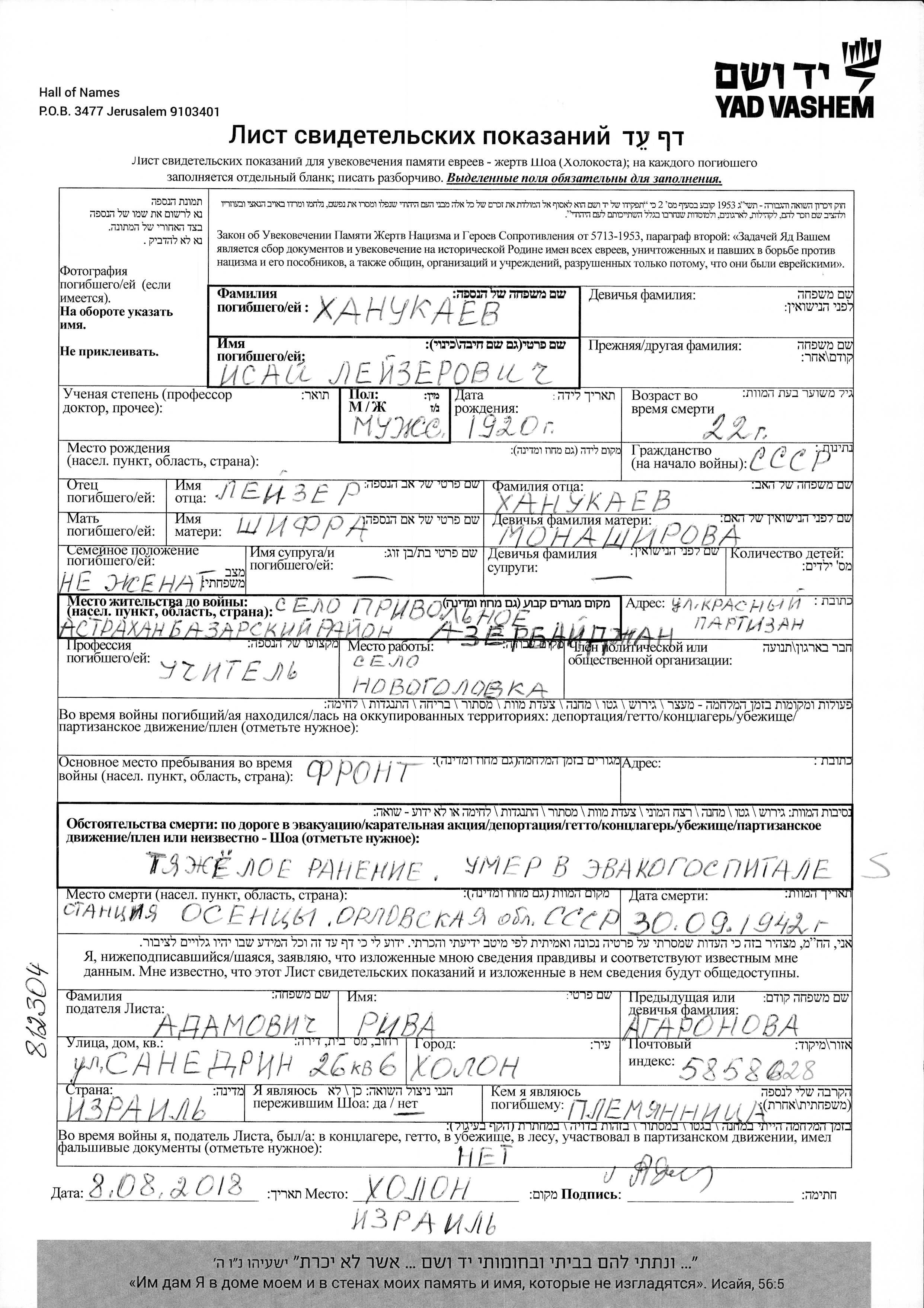 Khanukayev Isay 1920 Privolnoye, Azerbaijan (URSS) Feuille de témoignage