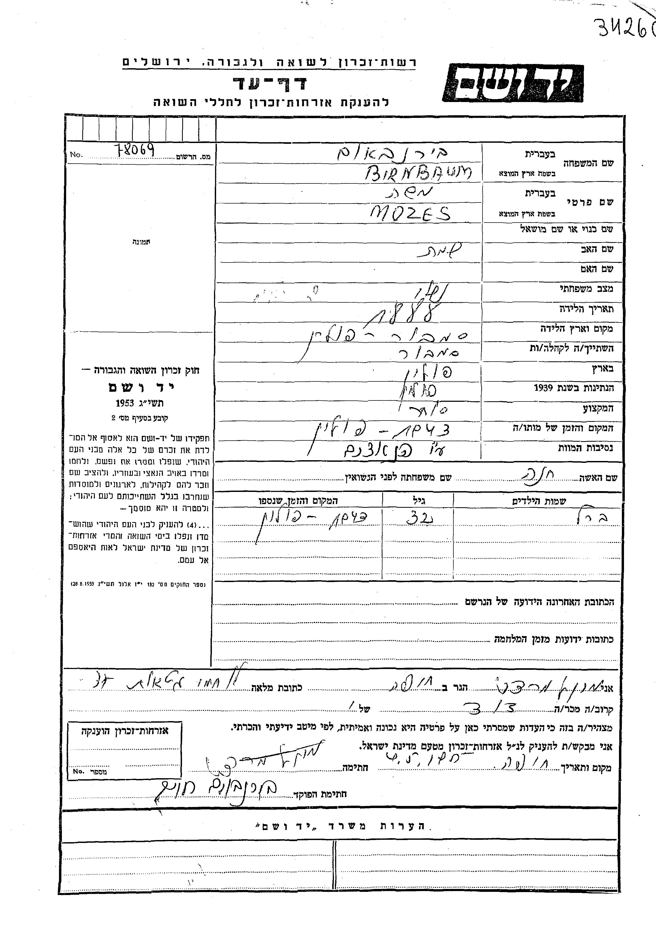 Birnbaum Mozes 1888 Sambor, Pologne Feuille de témoignage