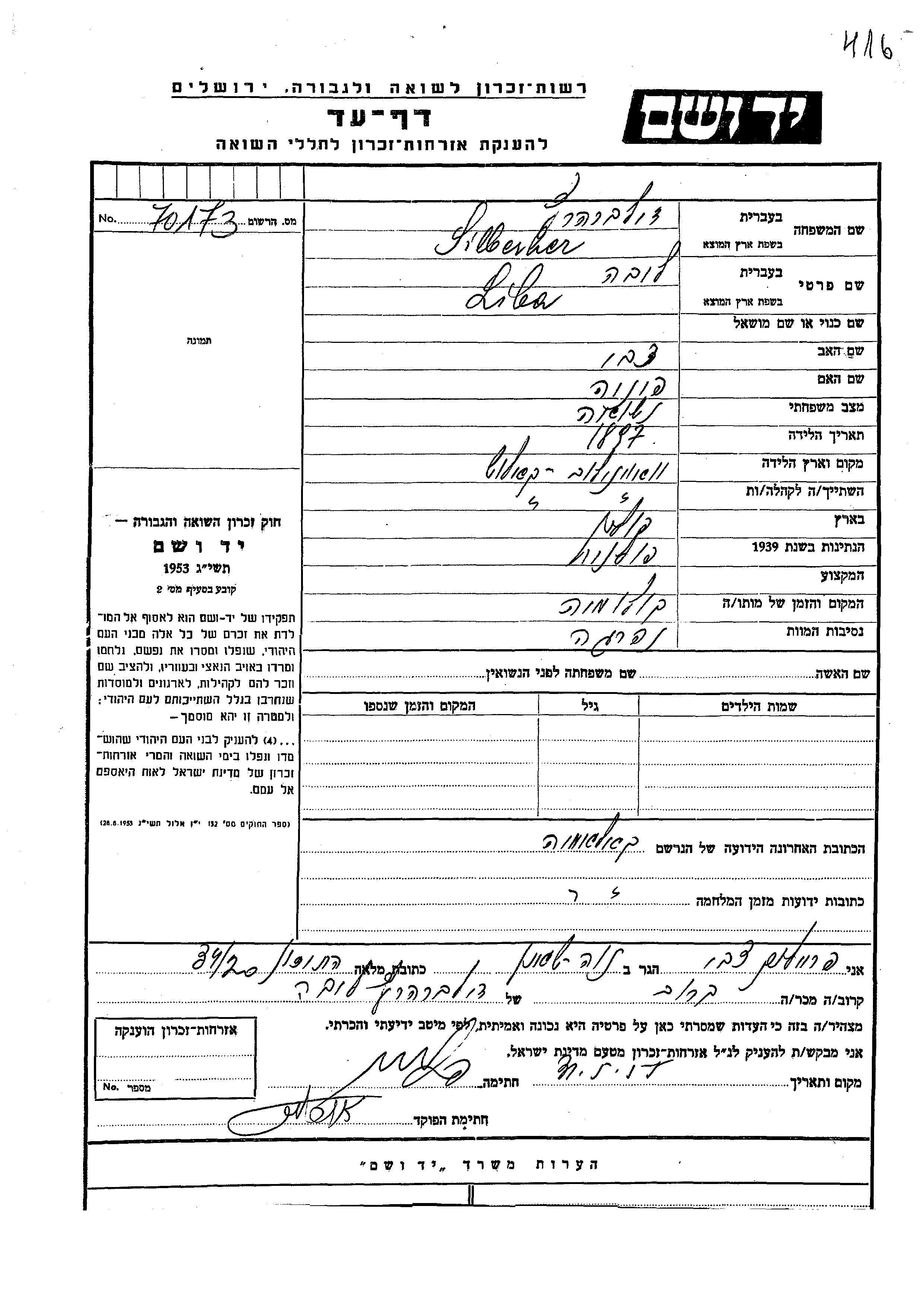Liba Zilberher Zilberhertz est née à Wojnilow, Pologne en 1897, fille de Tzvi et de Donia. Elle était Mariée. Avant la seconde guerre mondiale elle vivait à Wojnilow, Pologne. Pendant la guerre, elle était à Kolomyia, Pologne.