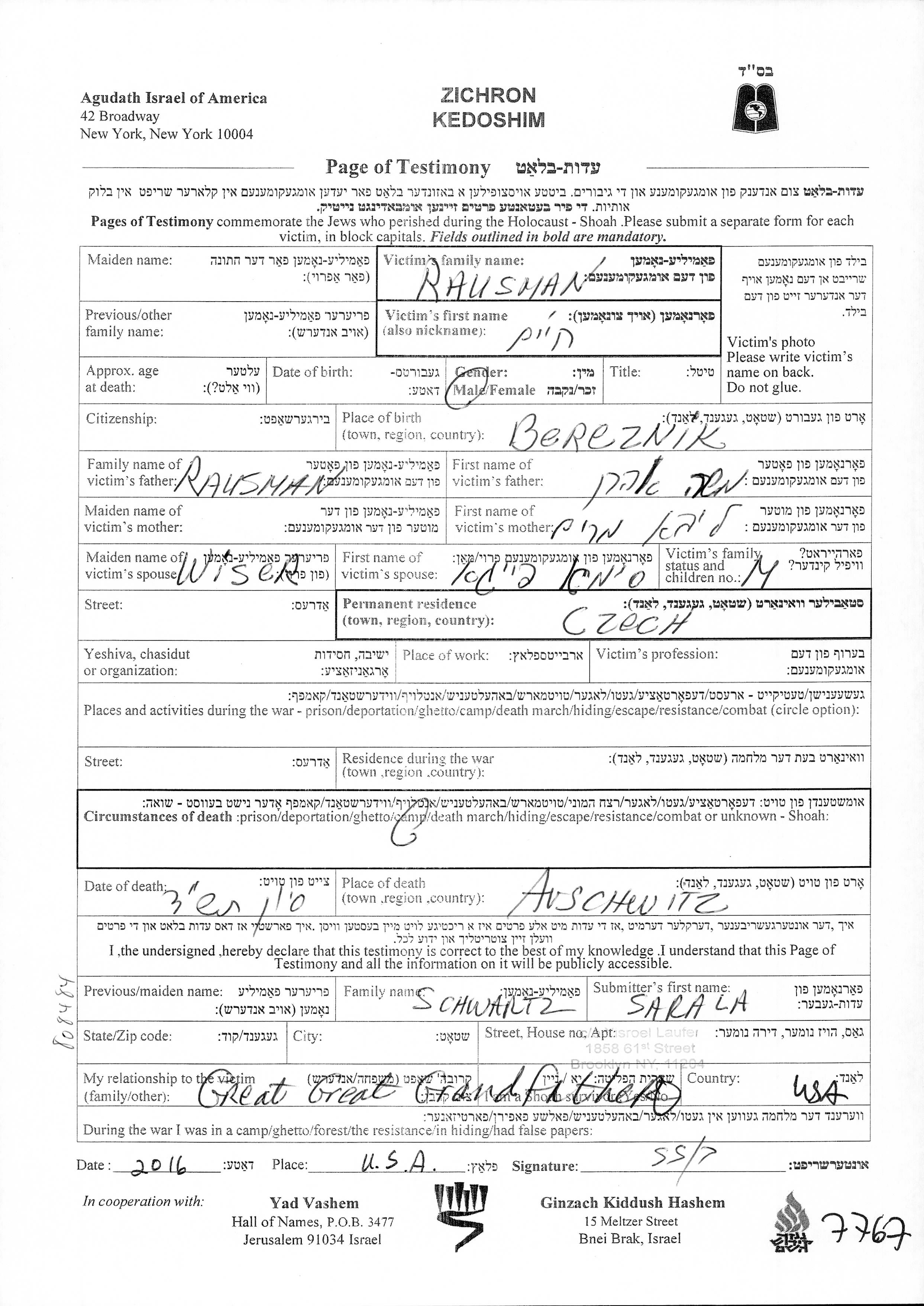 Rausman Chaim Tchécoslovaquie Feuille de témoignage