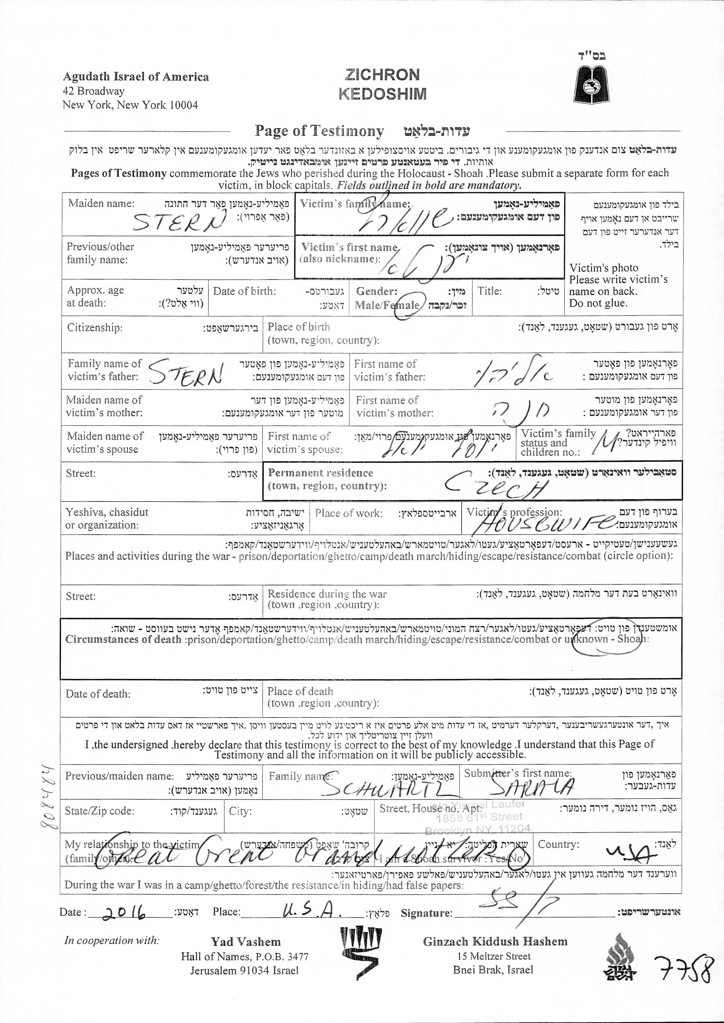 Ienta Shvartz née Stern est née fille de Eliahu et de Chana. Elle était Femme au foyer et Mariée à Joseph Yoel. Avant la seconde guerre mondiale elle vivait à Tchécoslovaquie.