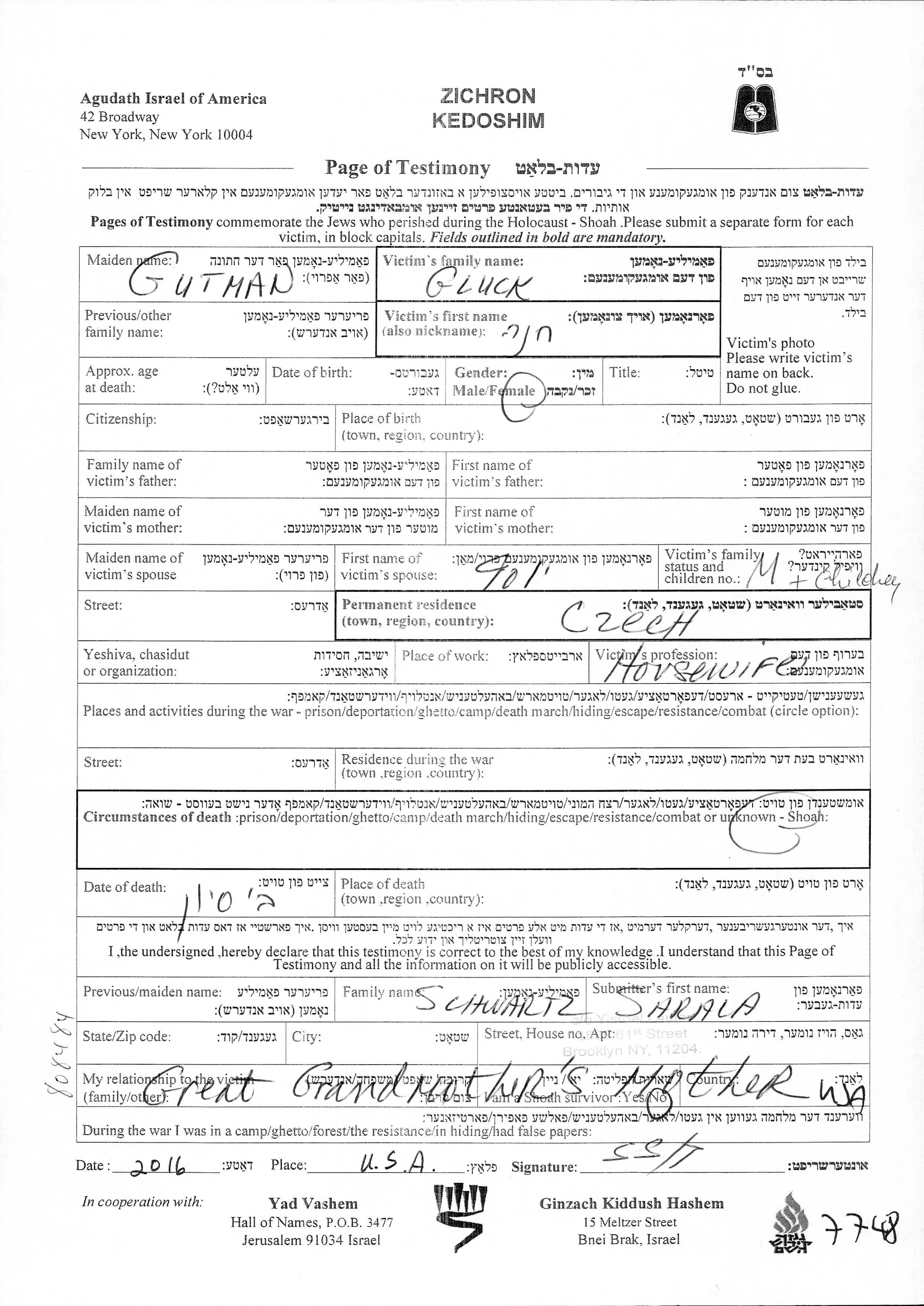 Gluck Chana Tchécoslovaquie Feuille de témoignage