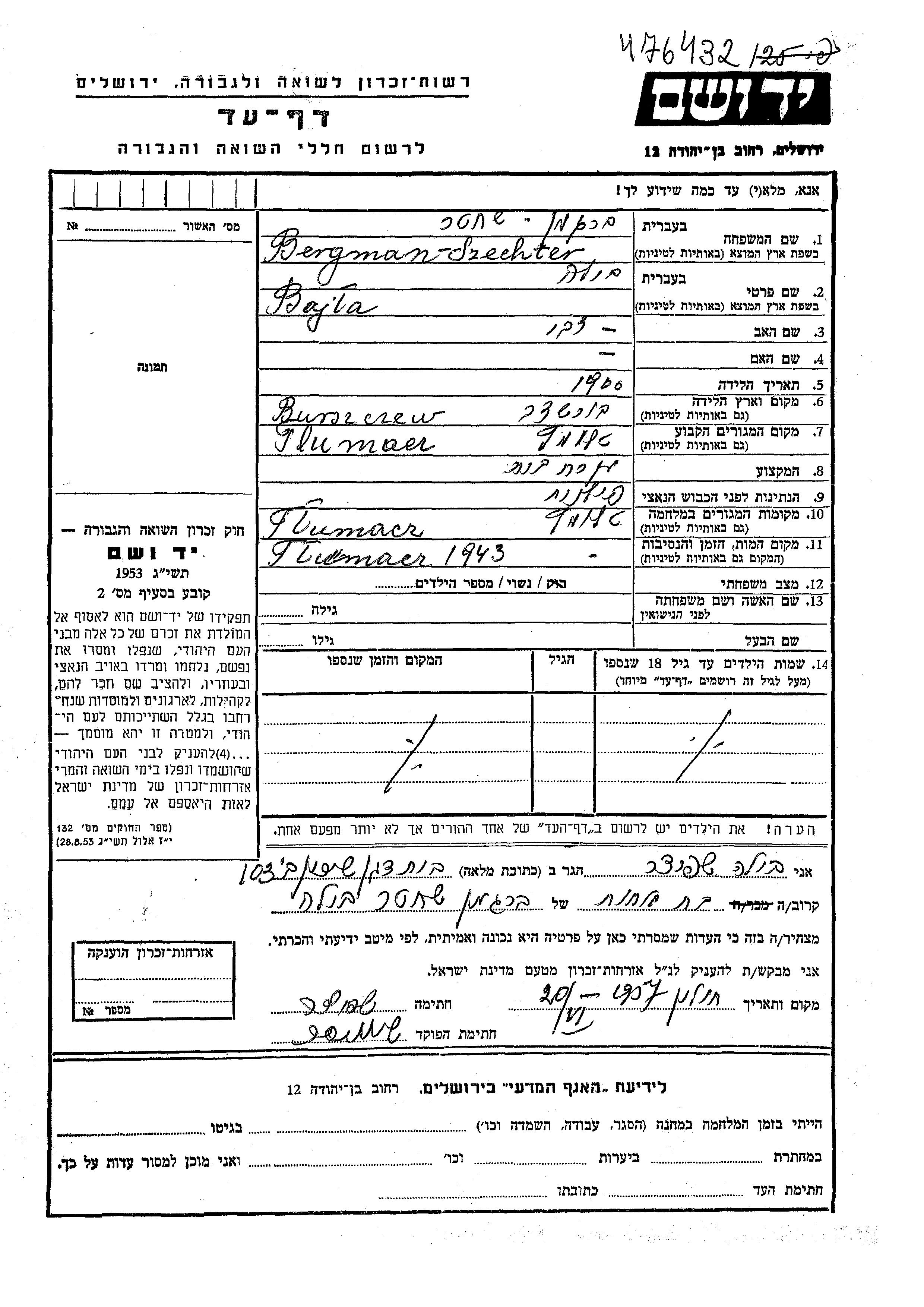 Bajla Szechter Bergman est née à Borszczow, Pologne en 1900, fille de Tzvi. Elle était Femme au foyer et Mariée. Avant la seconde guerre mondiale elle vivait à Tłumacz, Pologne. Pendant la guerre, elle était à Tłumacz, Pologne.
