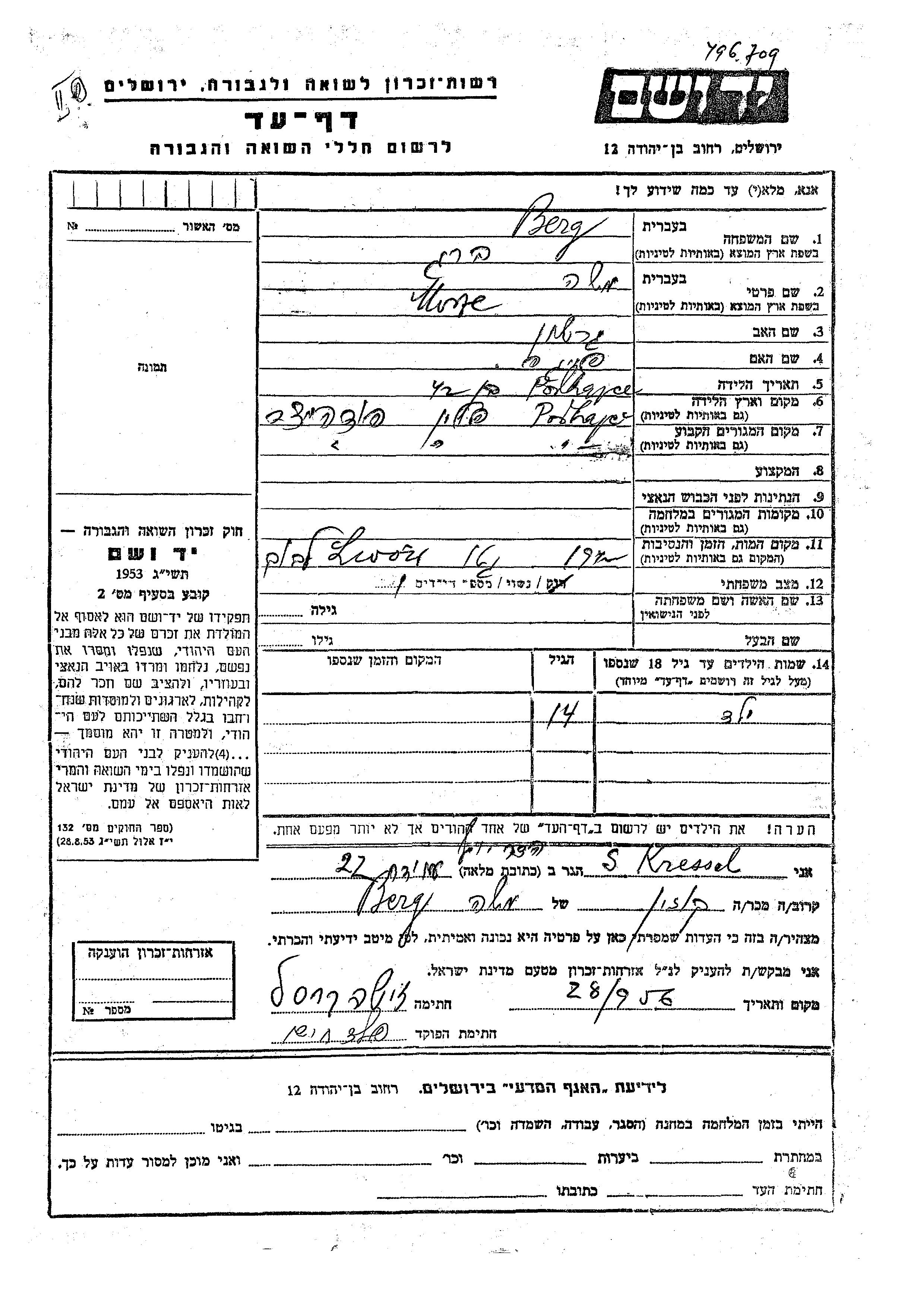 Mosze Berg est né à Podhajce, Pologne, fils de Gershon et de Feiga. Il était Marié. Avant la seconde guerre mondiale il vivait à Podhajce, Pologne. Au cours de la guerre, il était à Podhajce, Pologne.