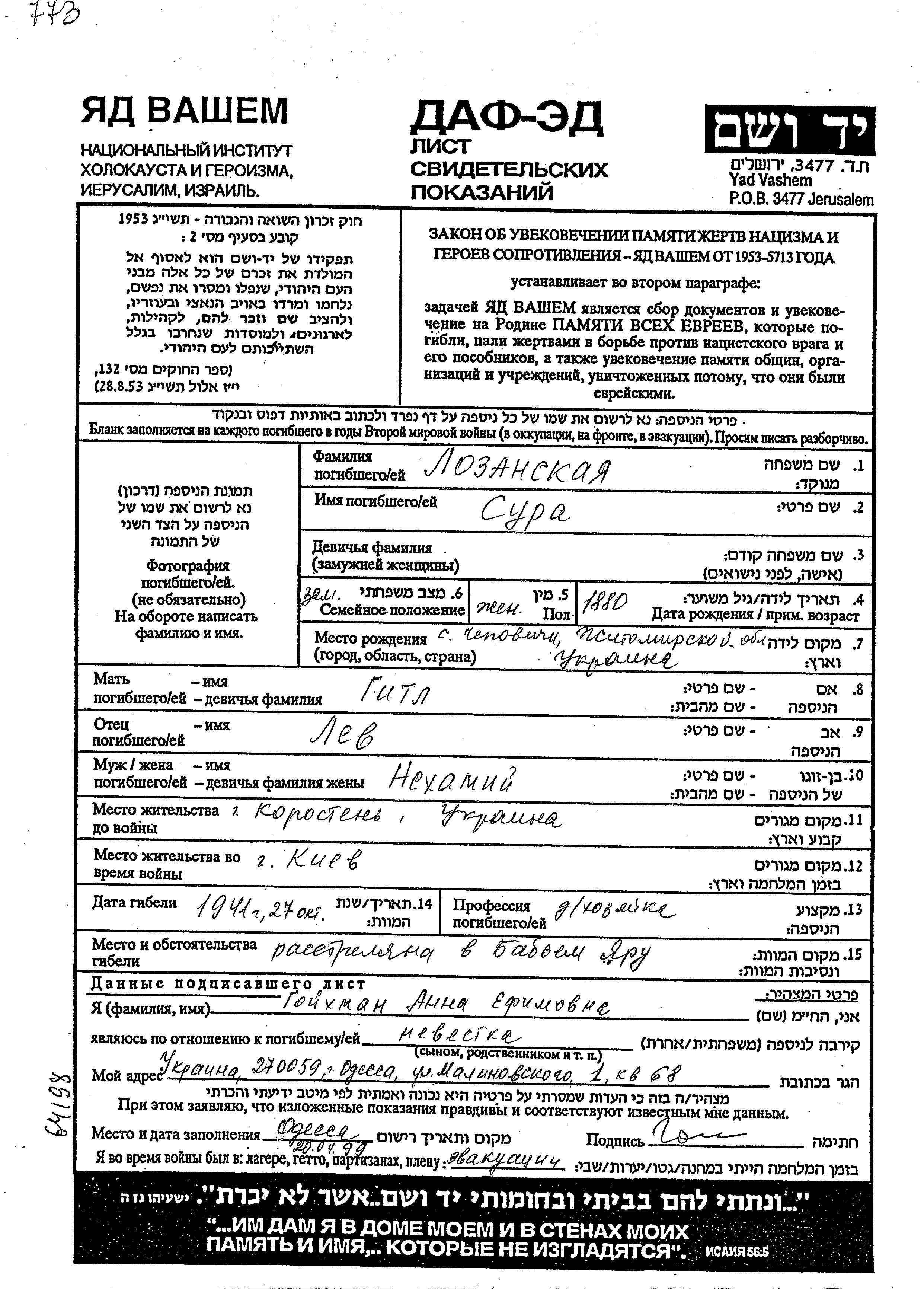 Lozanskaya | Sura | 1880 | Korosten, Ukraine (URSS) | Liste de personnes persécutées |