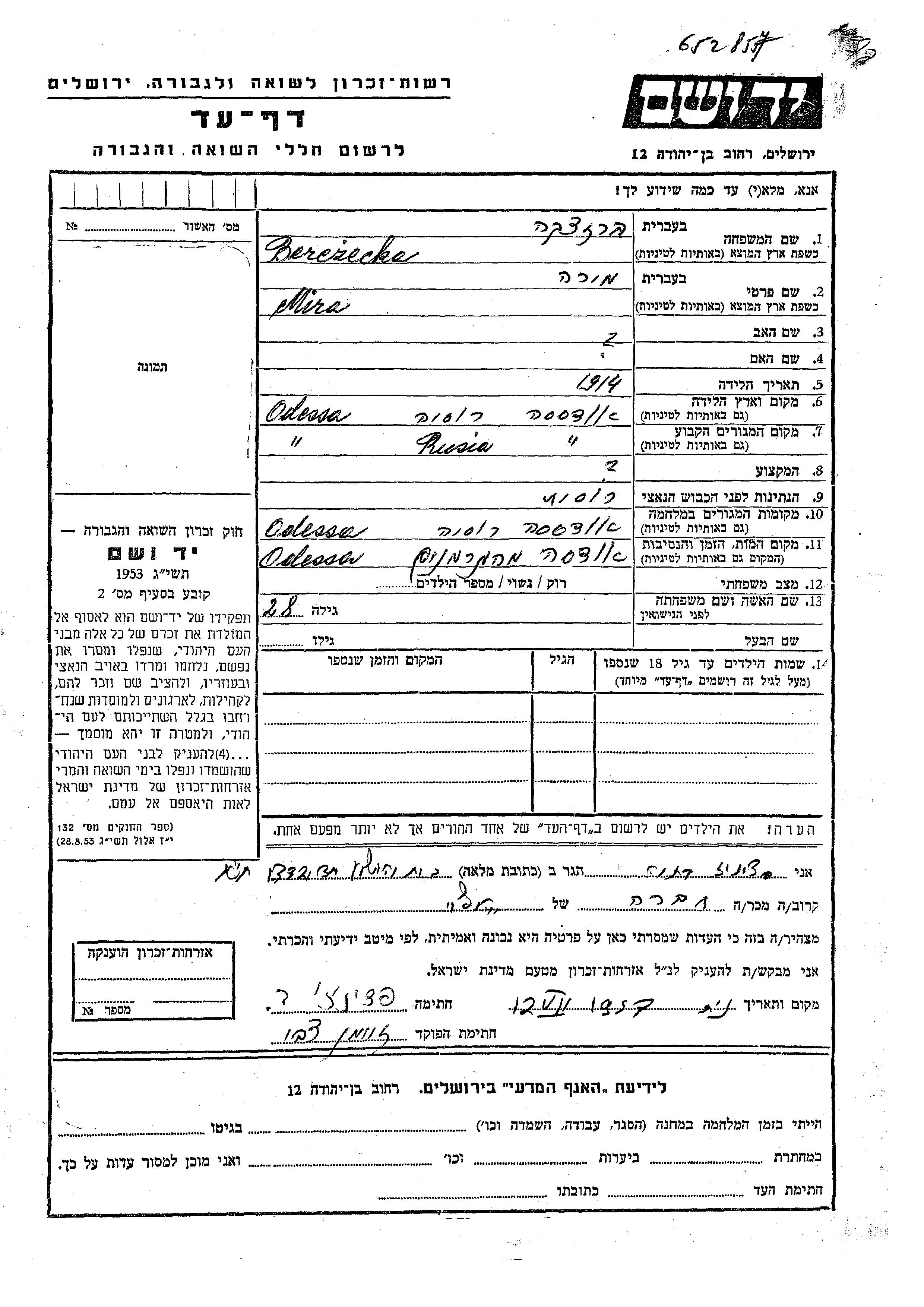 Berczecka Mira 1914 Odessa, Ukraine (URSS) Feuille de témoignage
