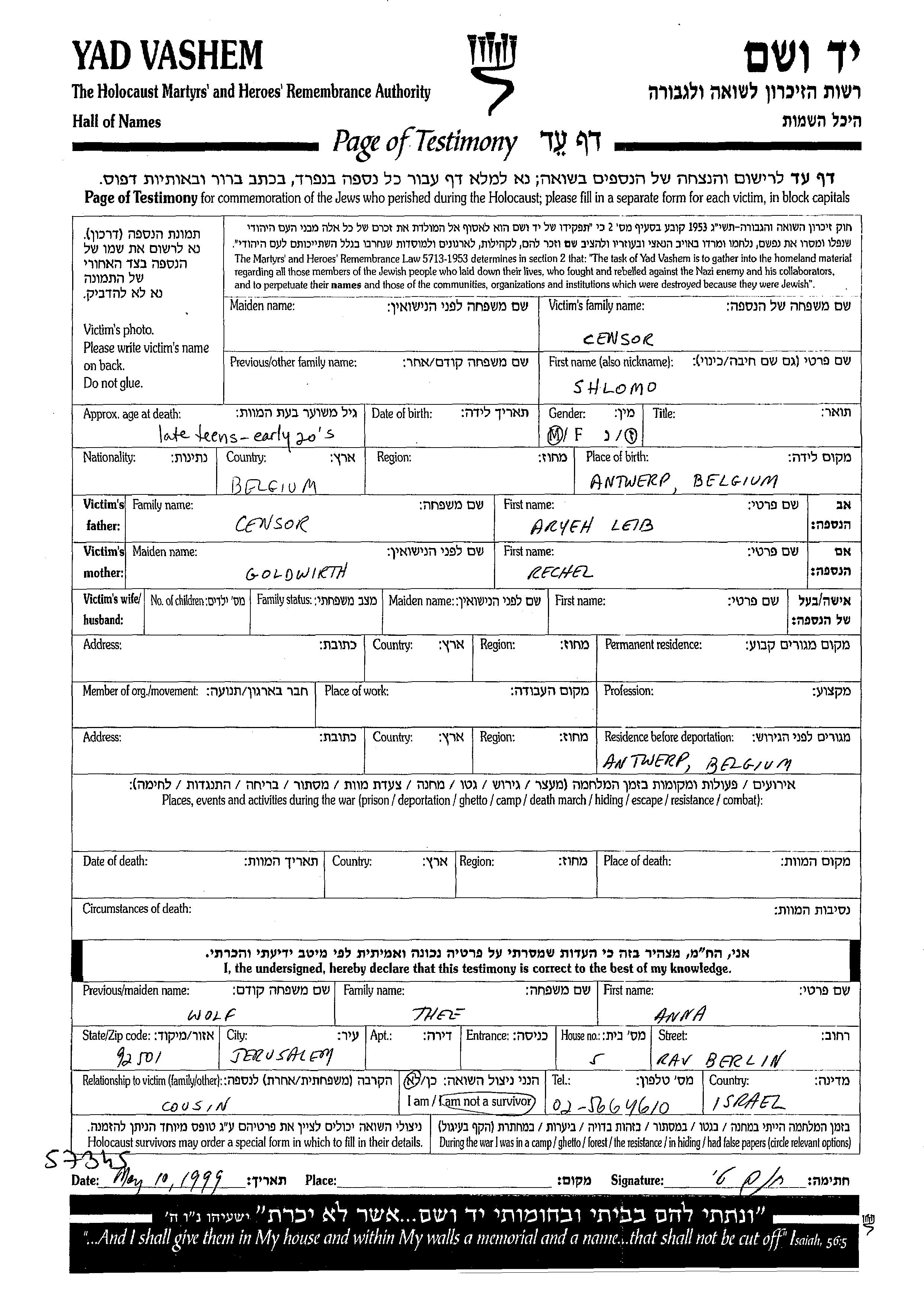 Censor Shlomo endroit inconnu, Feuille de témoignage