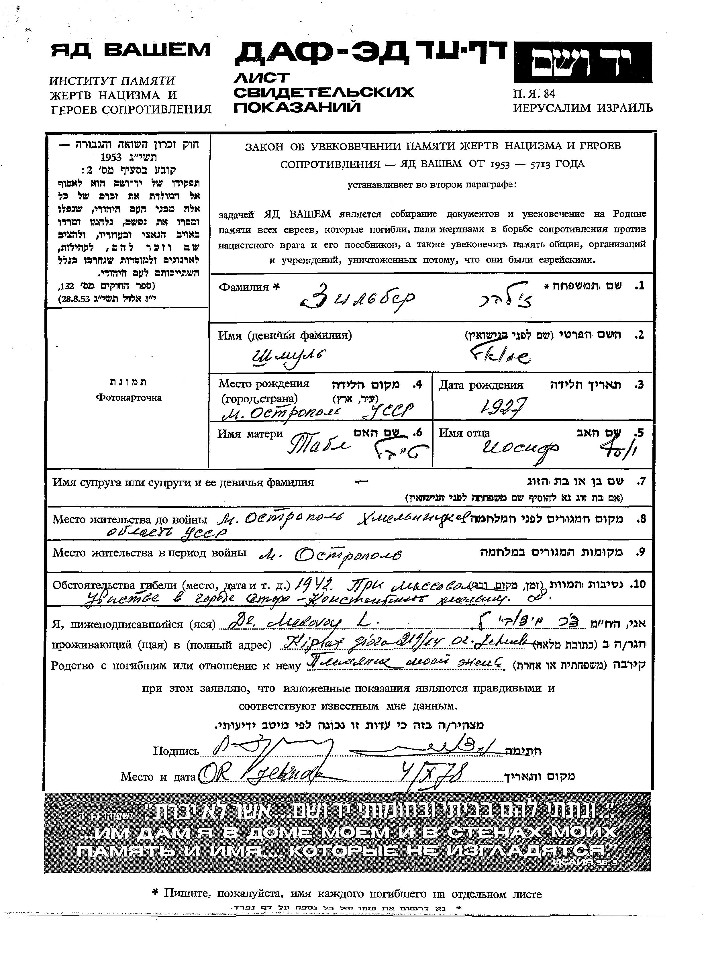 Zilber | Shmul | 1927 | Ostropol, Ukraine (URSS) | Feuille de témoignage |