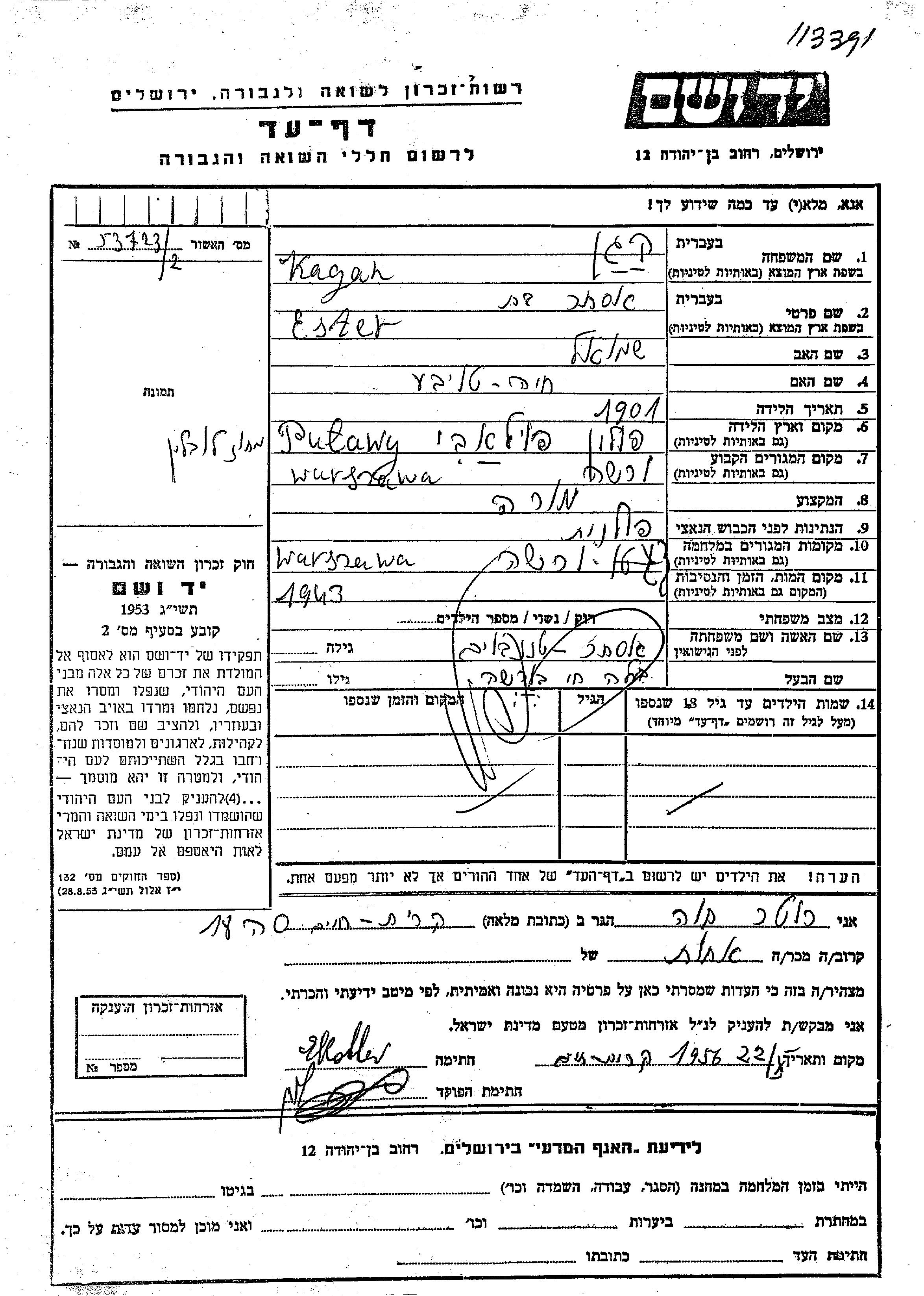 Kagan Esther Rachel 1901 Warsaw, Pologne Feuille de témoignage