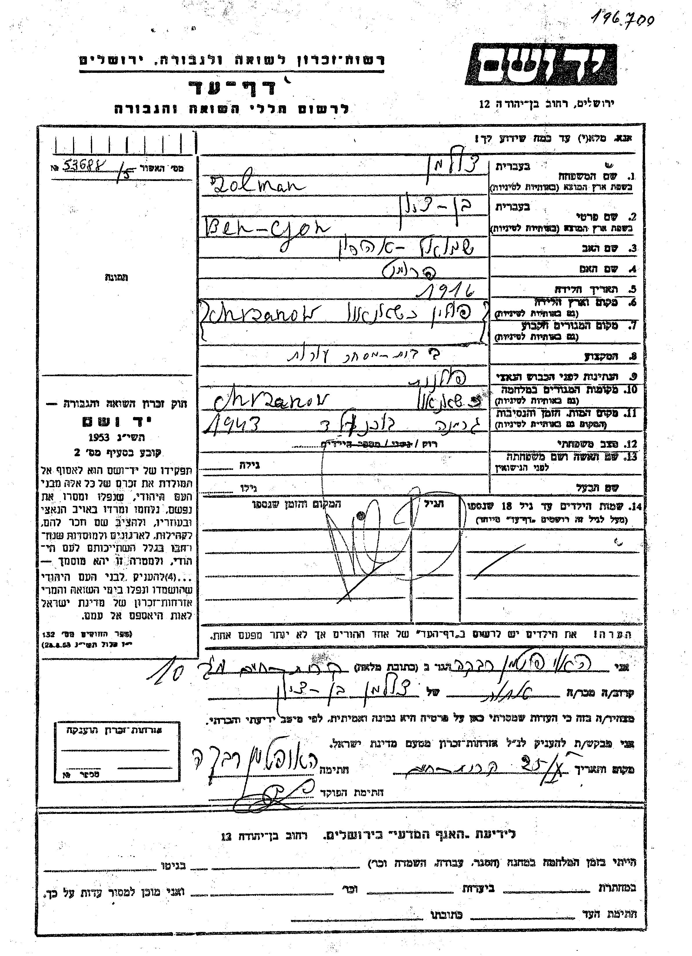 Zolman Tzolman Ben Cyon 1916 Chrzanow, Pologne Feuille de témoignage