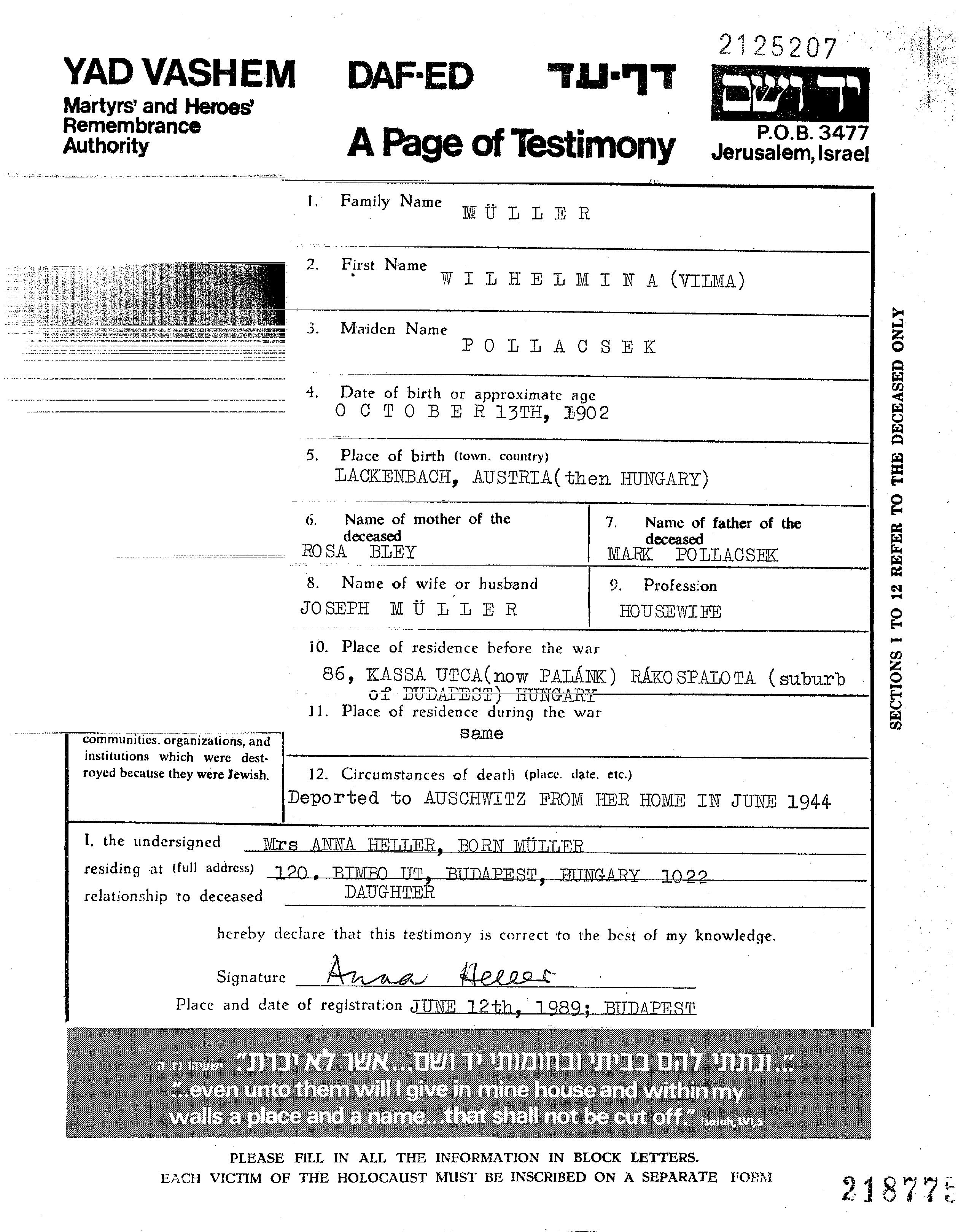 Vilhelmina Mueller née Pollacsek est née en 1902. Elle était Femme au foyer. Avant la seconde guerre mondiale elle vivait à Rakospalota, Hongrie.