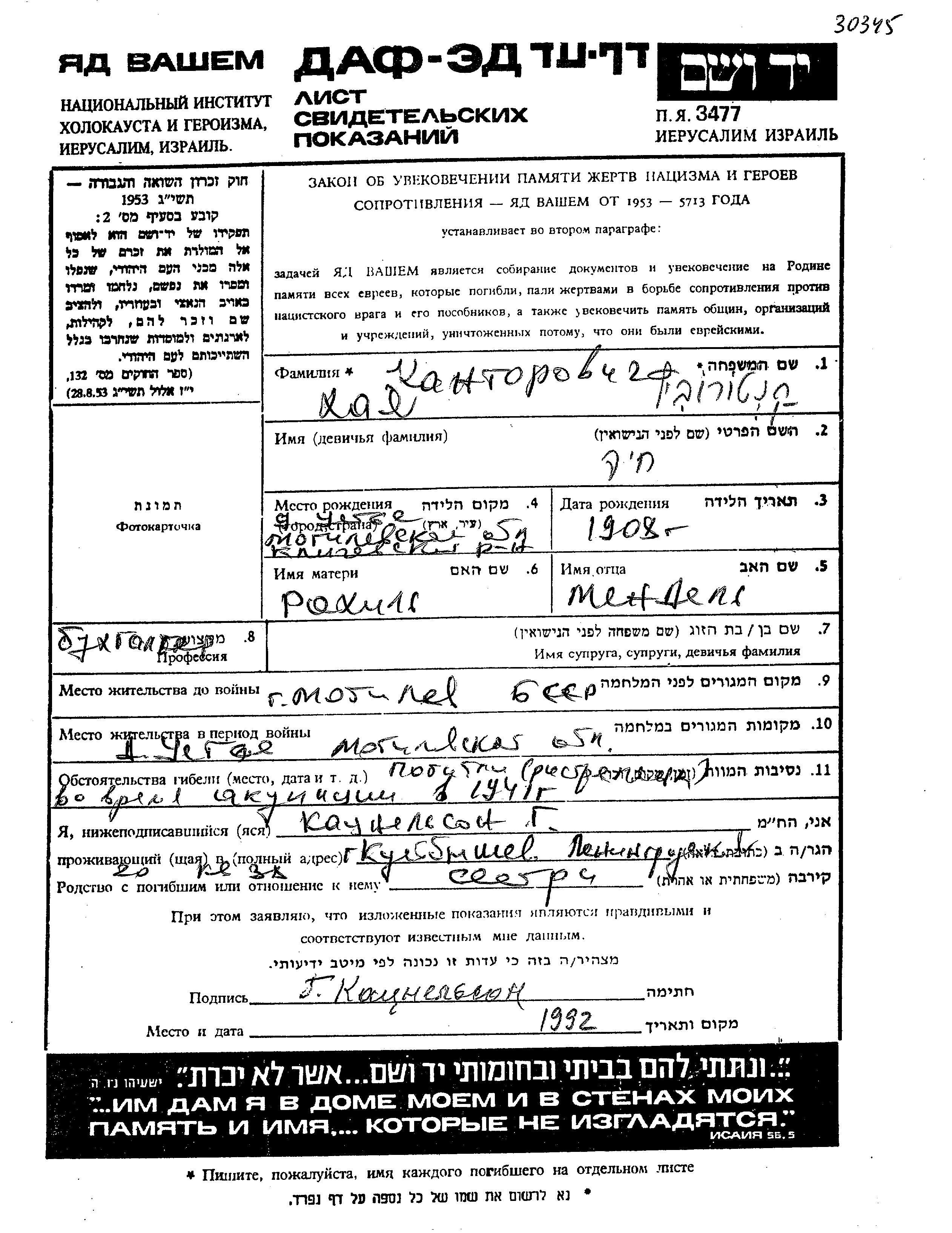 Kantorovich | Khaia | 1908 | Mogilev, Bélorussie (URSS) | Feuille de témoignage |