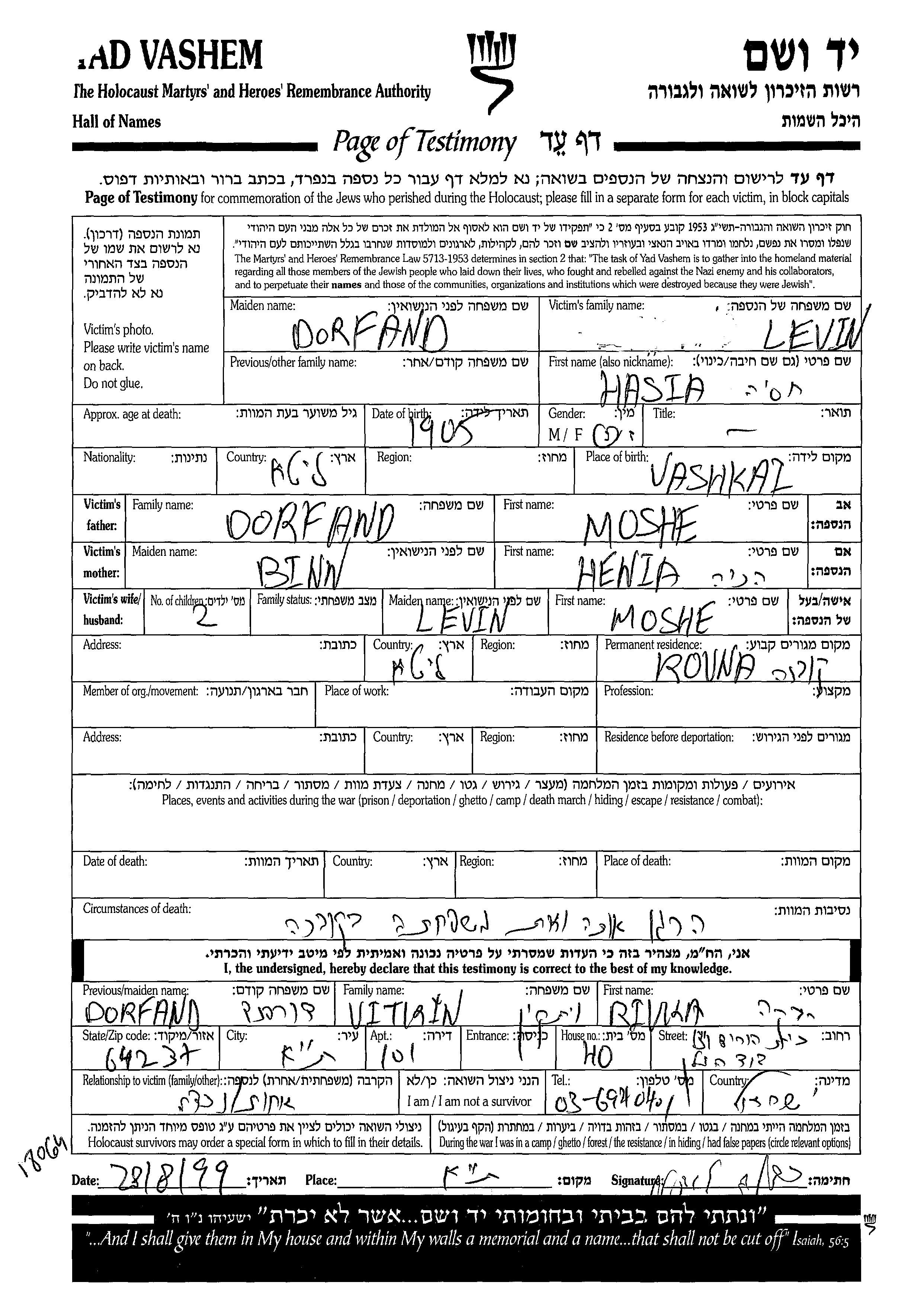 Levin | Hasia | 1905 | Kovna, Lituanie | Feuille de témoignage |