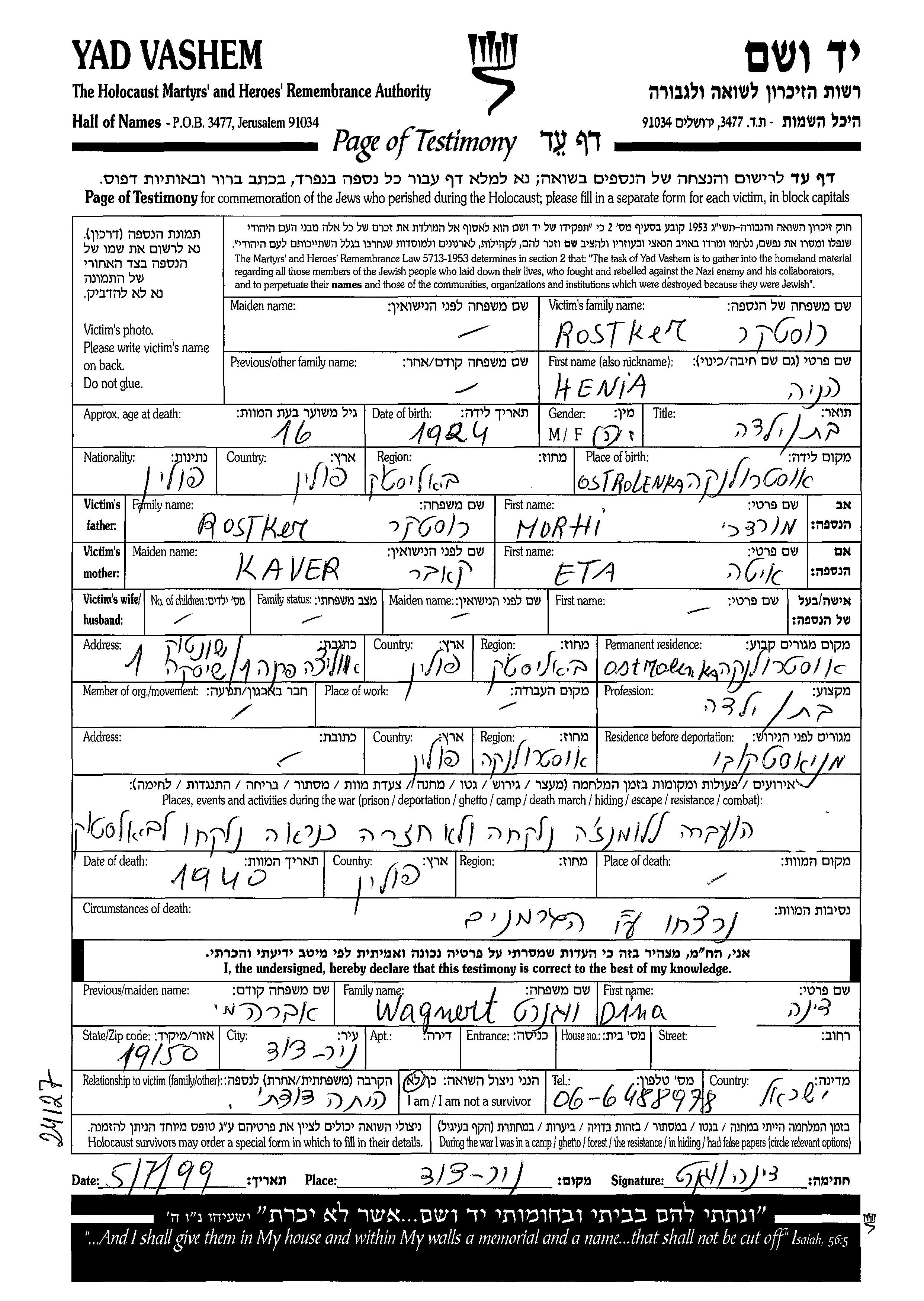Rostker | Henia | 1924 | Ostroleka, Pologne | Feuille de témoignage |