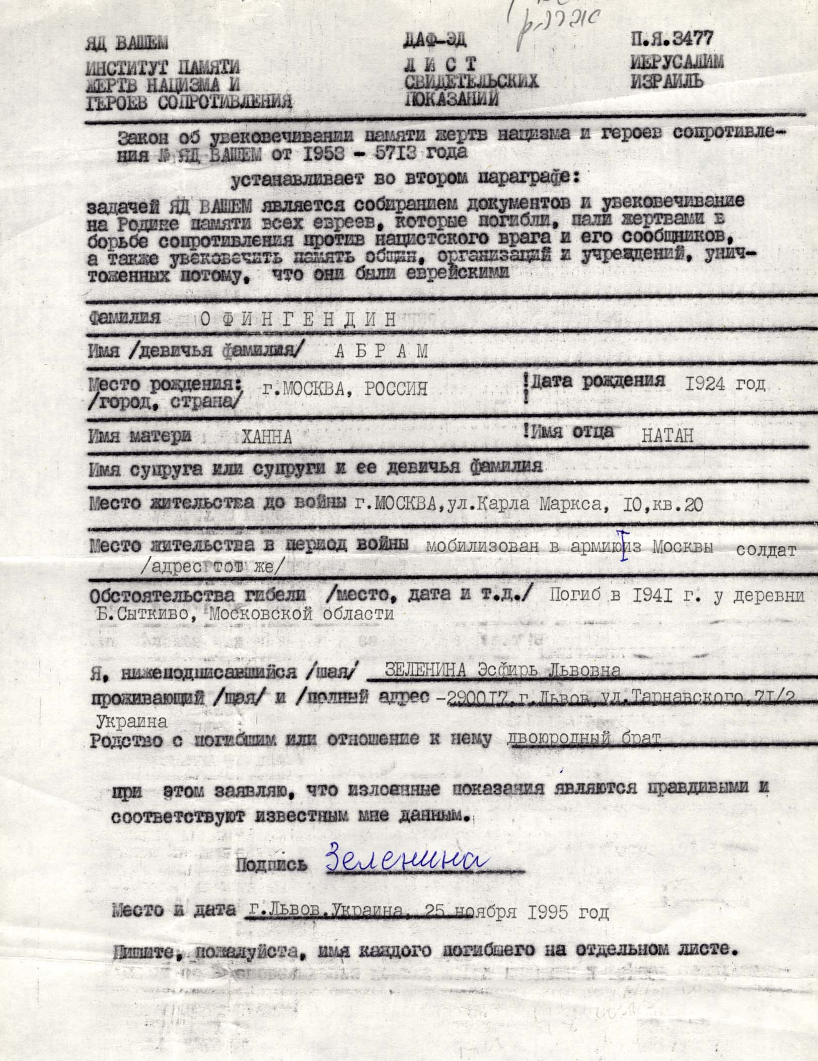 Avraham Ofingendin est né à Moskva, Russie (URSS) en 1924. Il était Soldat. Avant la seconde guerre mondiale il vivait à Moskva, Russie (URSS).