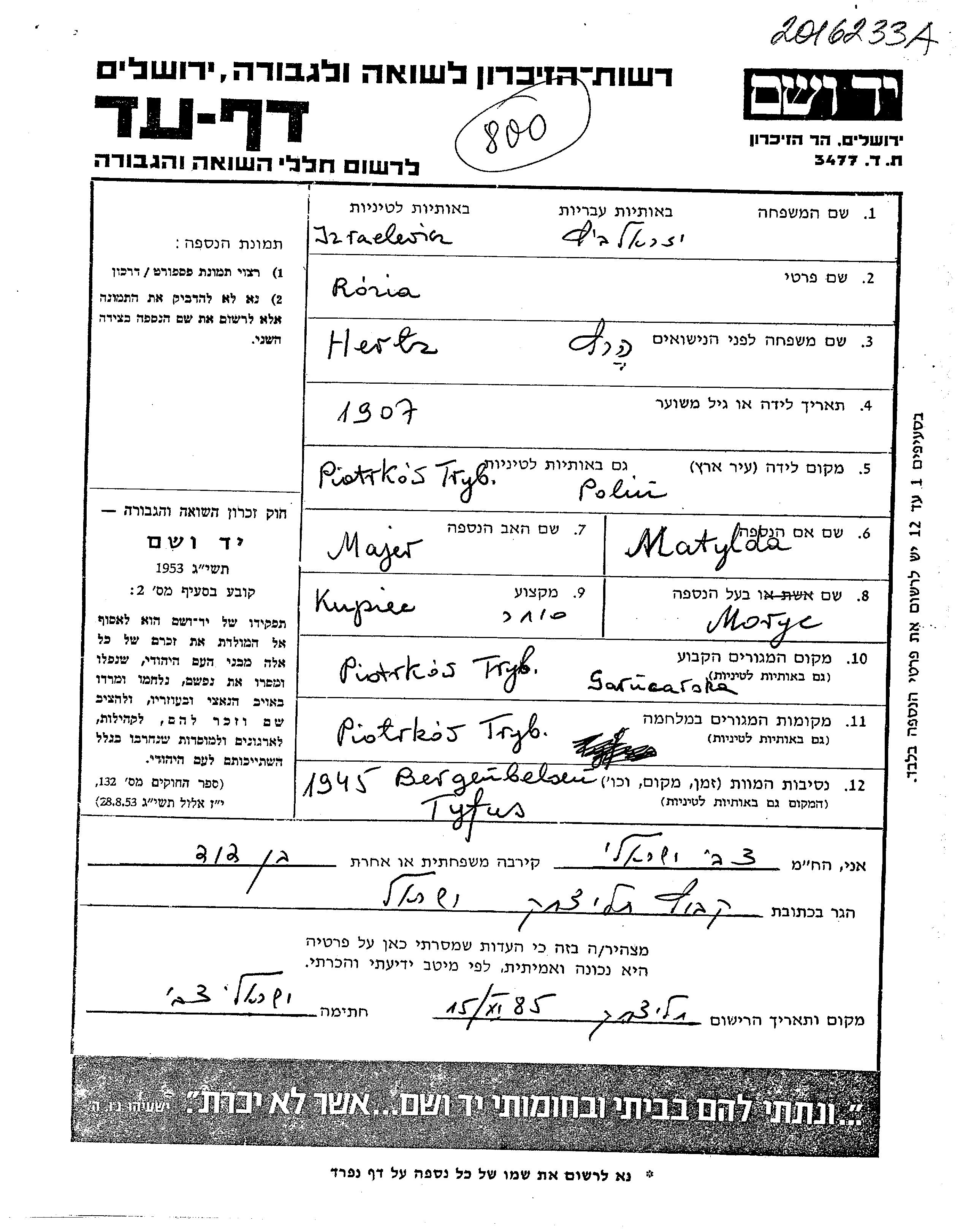 Izraelewicz Rozia 1907 Piotrkow Trybunalski, Pologne Feuille de témoignage