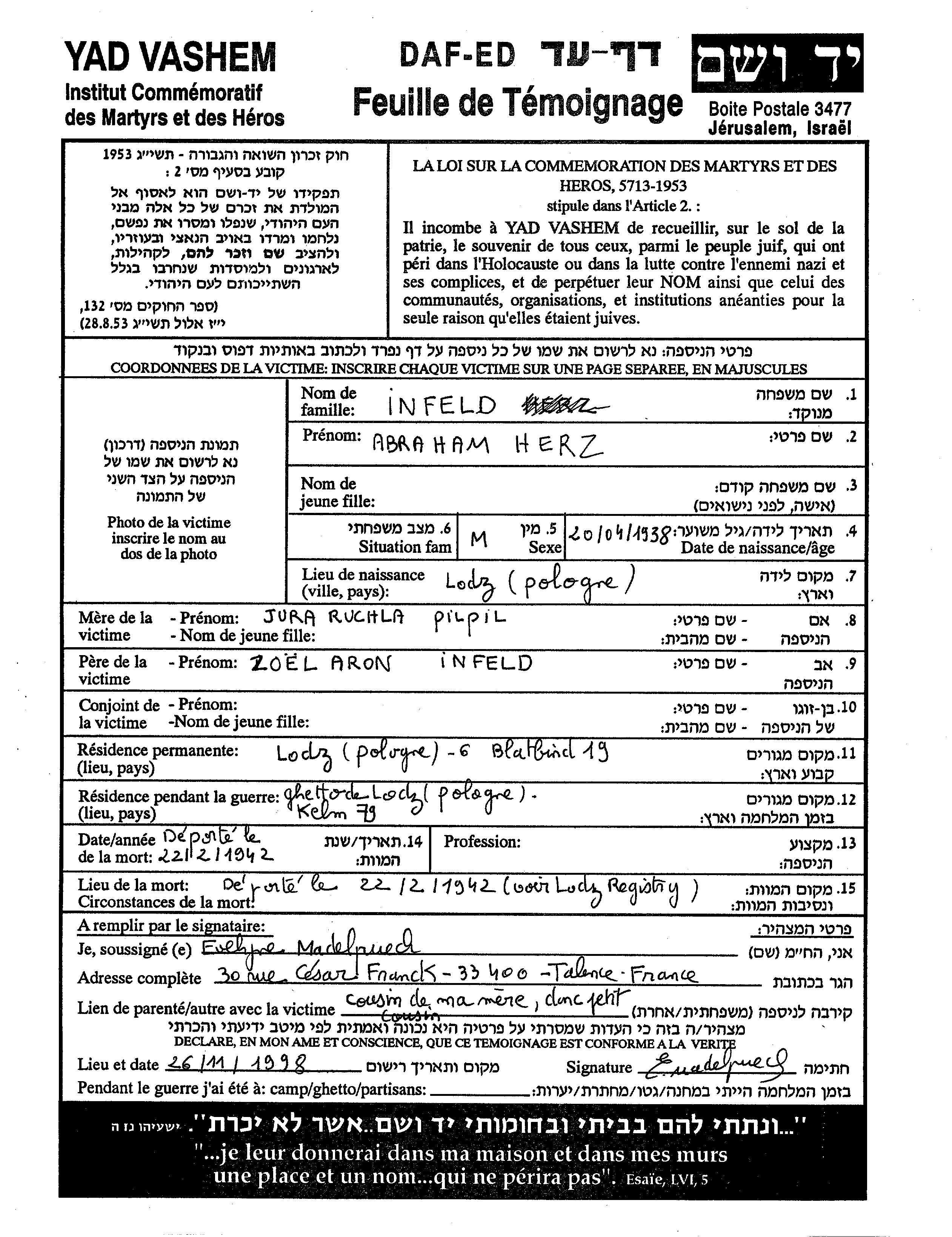 Infeld | Abraham Herz | 1938 | Lodz, Pologne | Feuille de témoignage |