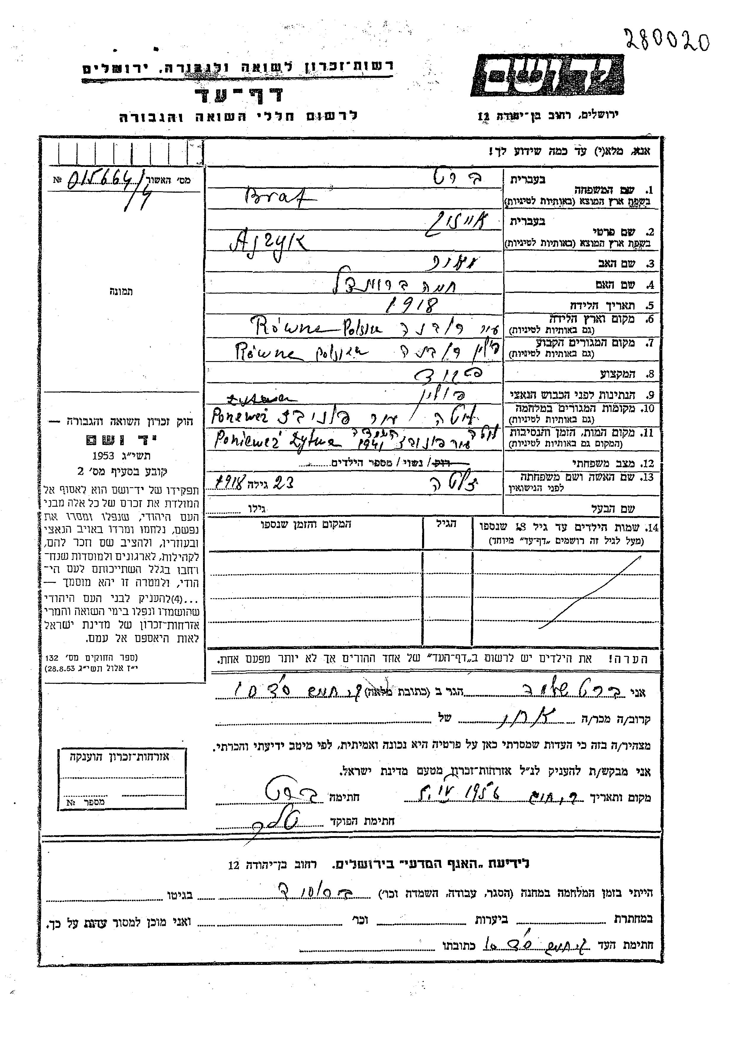 Brat Ajzyk 1918 Rowne, Pologne Feuille de témoignage