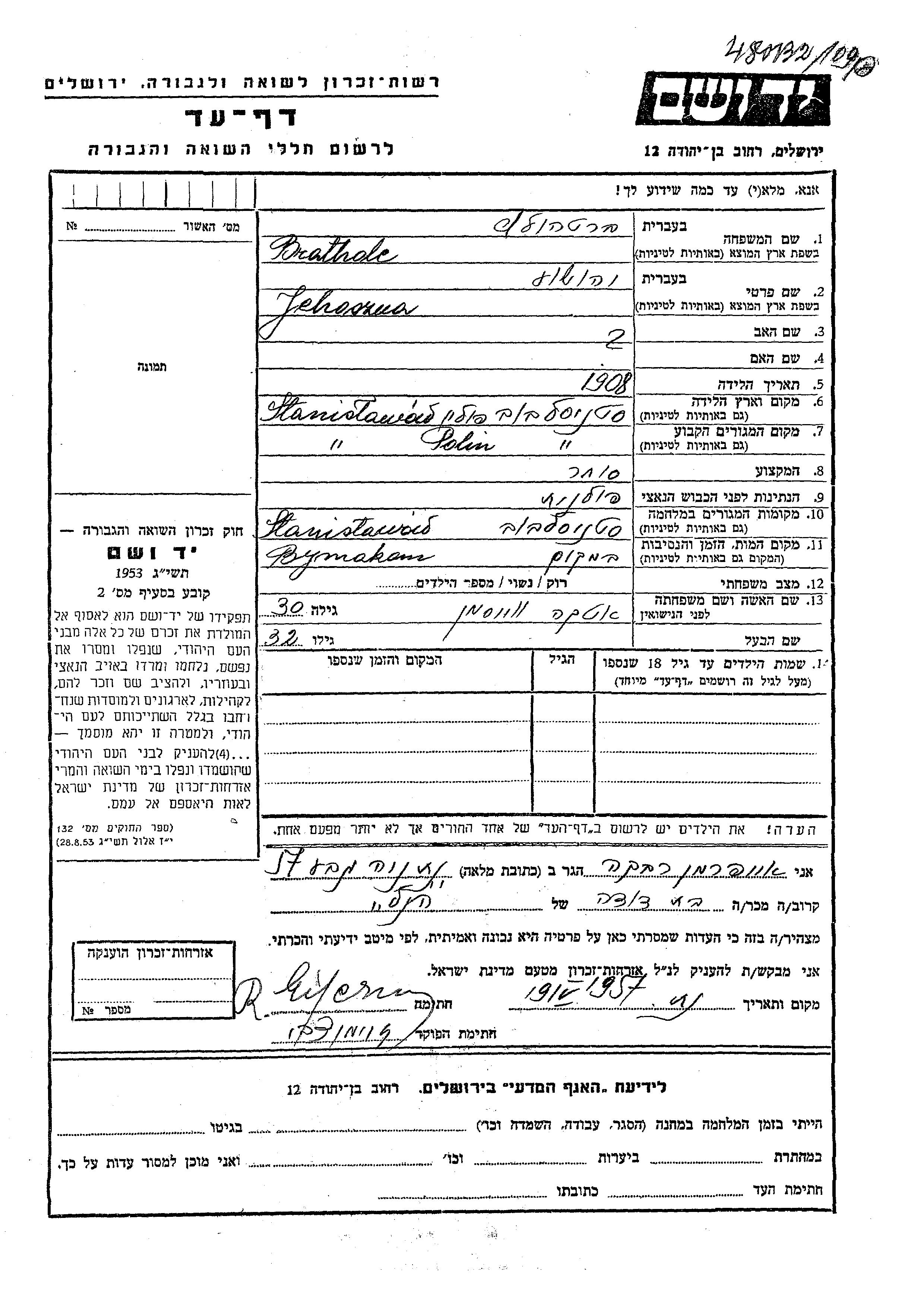 Bratholc Bretholtz Jehoszua 1908 Stanislavov, Pologne Feuille de témoignage