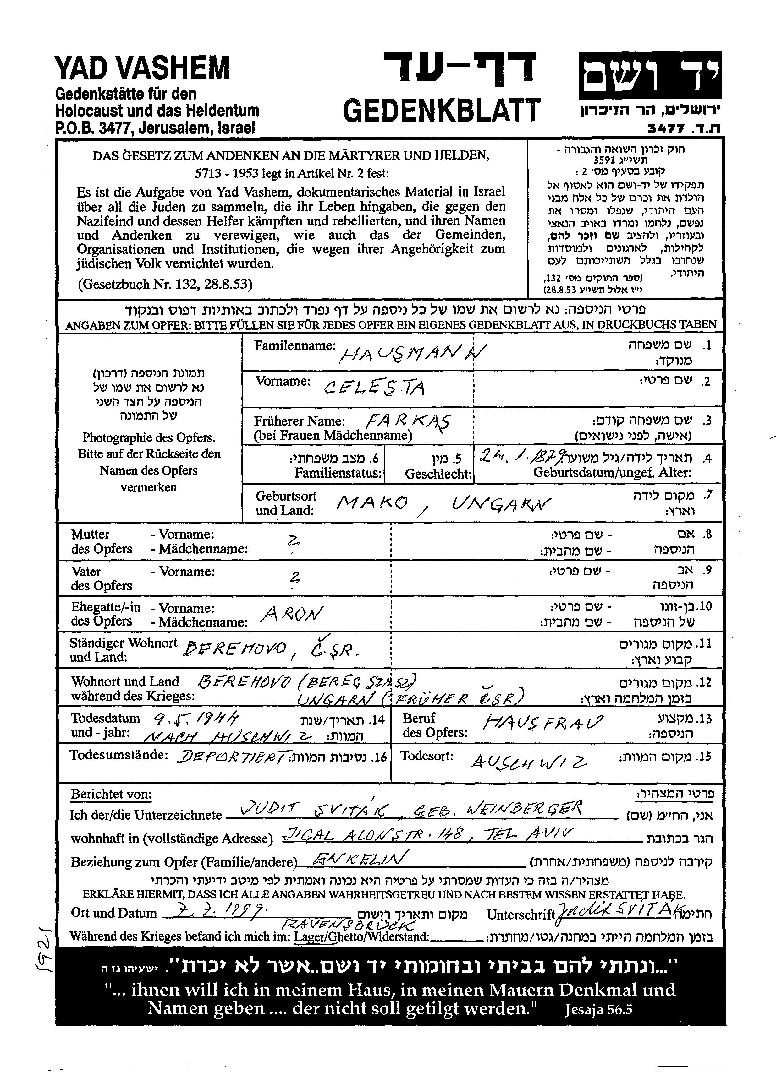 Celesta Hauzman née Farkas est née à Mako, Hongrie en 1879. Elle était Femme au foyer. Avant la seconde guerre mondiale elle vivait à Berehovo, Tchécoslovaquie.