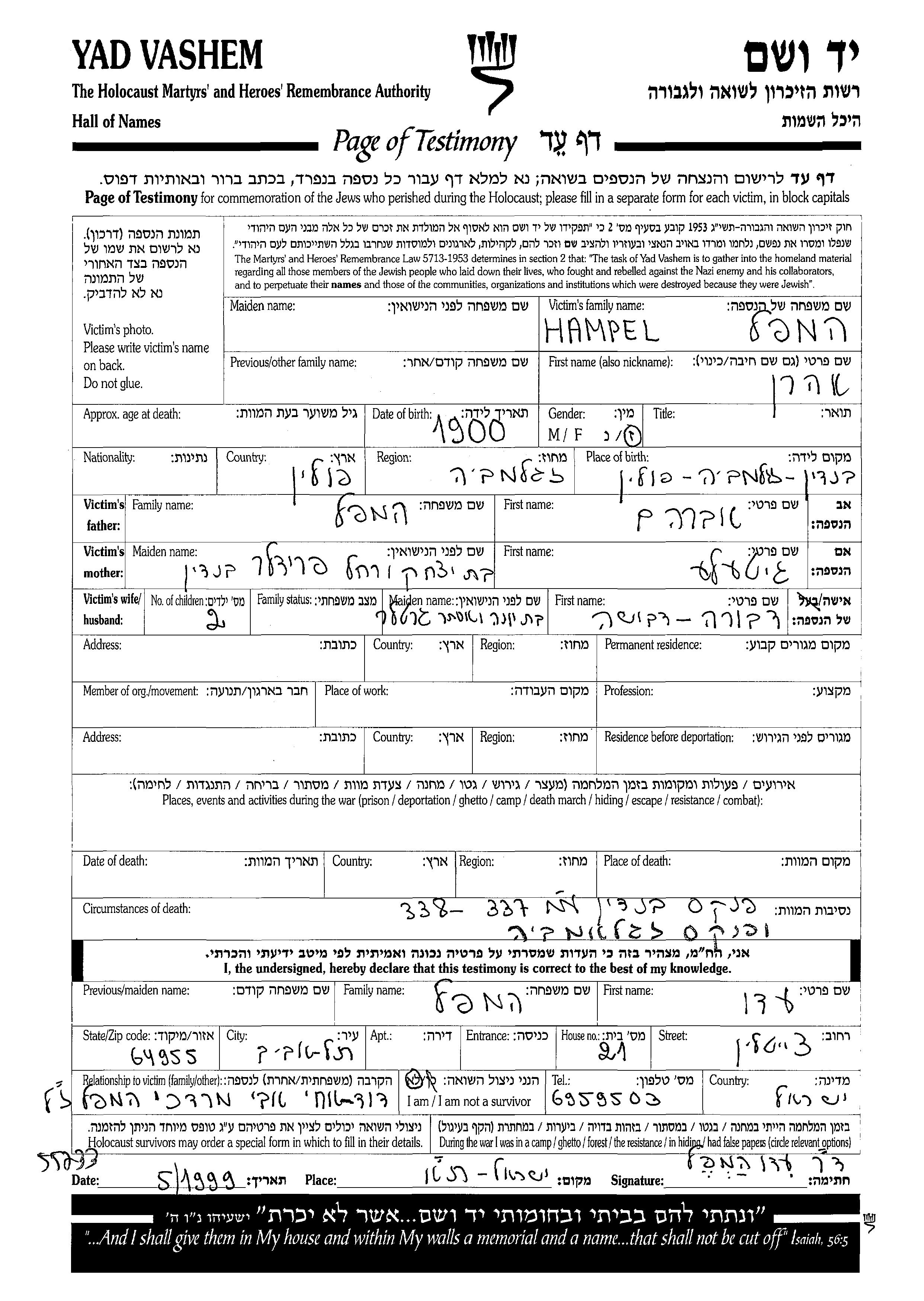 Hampel Aharon 1900 endroit inconnu, Feuille de témoignage