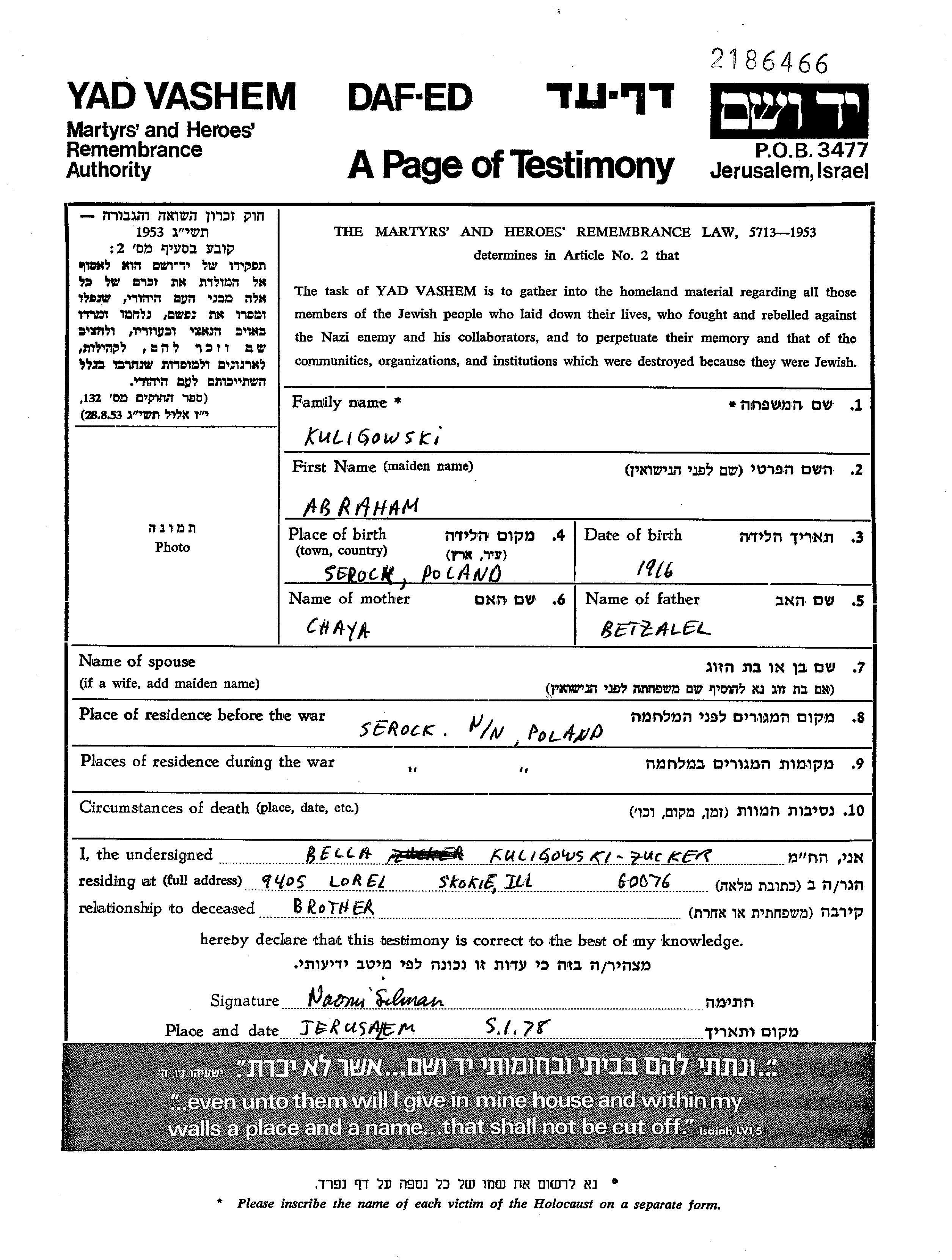 Kuligowski Abraham 1916 Serock, Pologne Feuille de témoignage