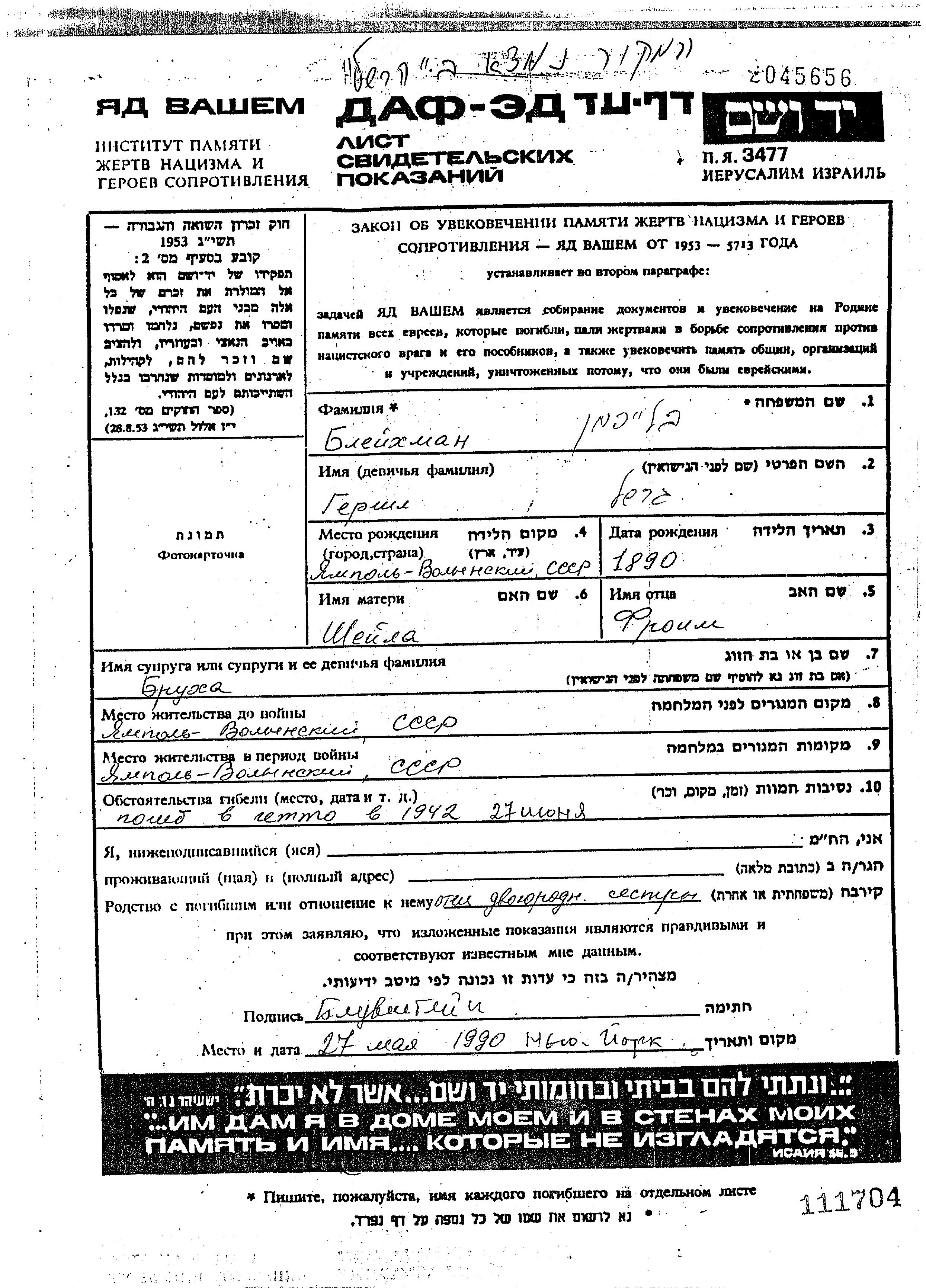 | Bleikhman | Gershl | 1890 | Yampol Volynskiy, Ukraine (URSS) | Feuille de témoignage |
