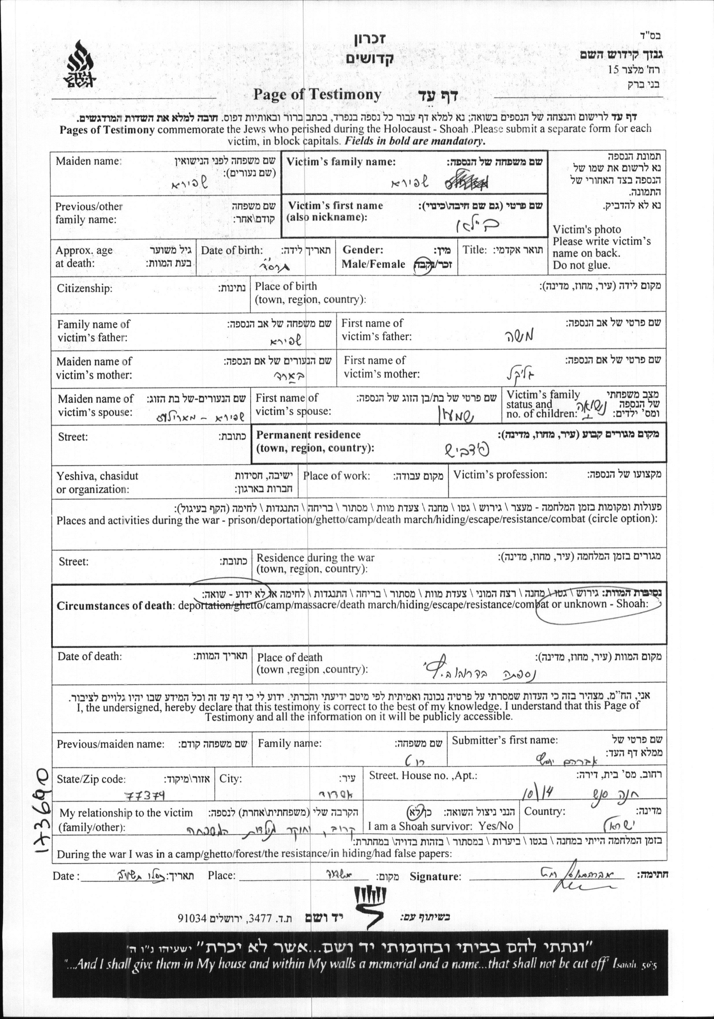 Yad Vashem - Pages of Testimony Names Memorial Collection