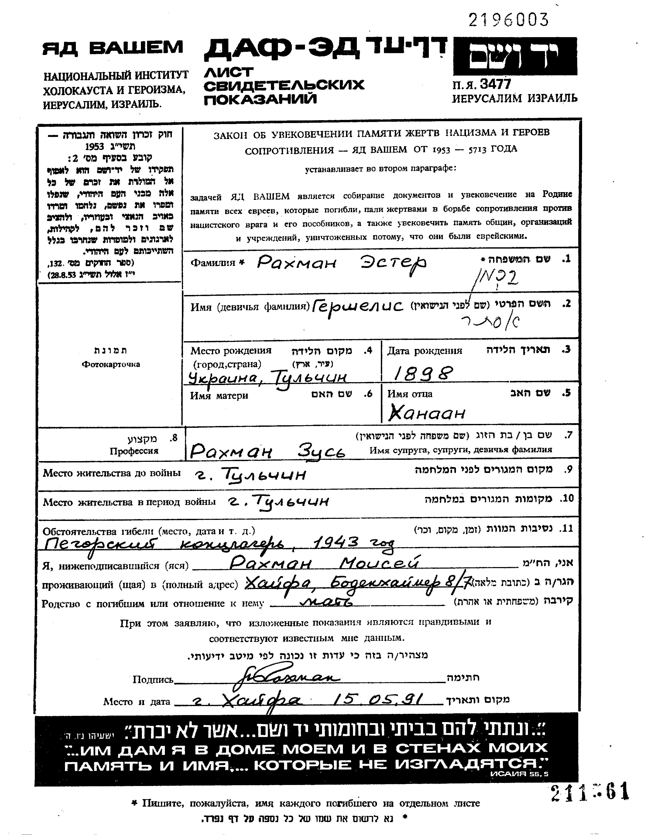 Rakhman Esfir Tulchin, Ukraine (URSS) Feuille de témoignage